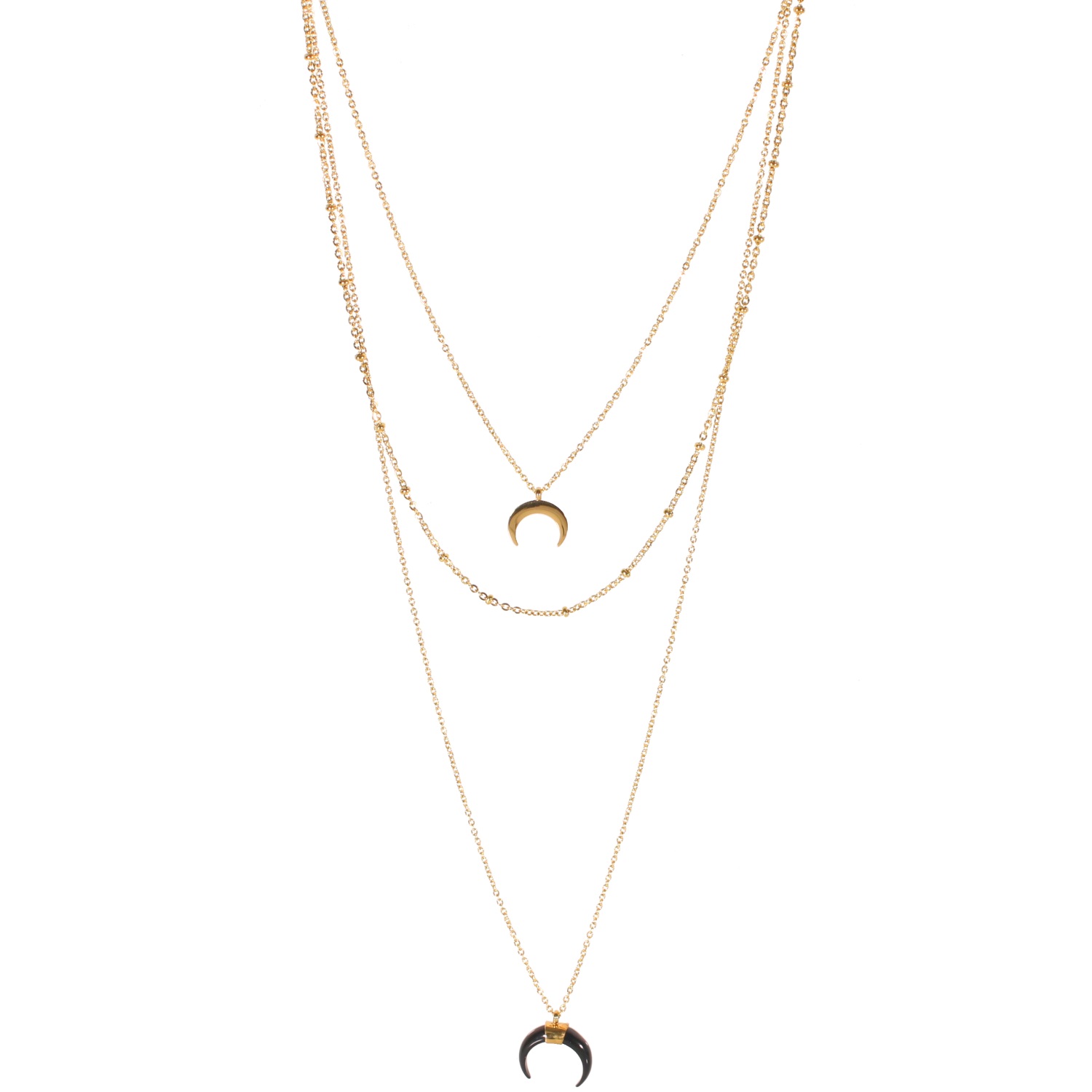 Description Collier triple rangs composé d'un collier de 38 cm de long avec pendentif croissant en acier doré, un collier de 42 cm de long en acier doré ainsi qu'un collier de 60 cm de long en acier doré et pendentif croissant en matière synthétique. L'ensemble peut se régler jusqu'à 7 cm. Longueur 38+7 cm [Guide des tailles] Matière(s) Acier , Plastique . L'acier utilisé dans la bijouterie existe sous plusieurs qualités. Nous utilisons principalement la qualité 316L, qualité qui est utilisée en chirurgie. Cet acier est donc inoxydable et reste très résistant. Fermoir Mousqueton À noter Pendentif croissant 12x10 mm et pendentif croissant 15x15 mm Couleur(s) dominante(s) Doré , Noir Public Adolescent , Adulte . Genre Femme , Fille . Saison Indémodable . Collection Myriade Cliquez sur une matière, un thème, une couleur ou une collection pour voir tous les articles associés.