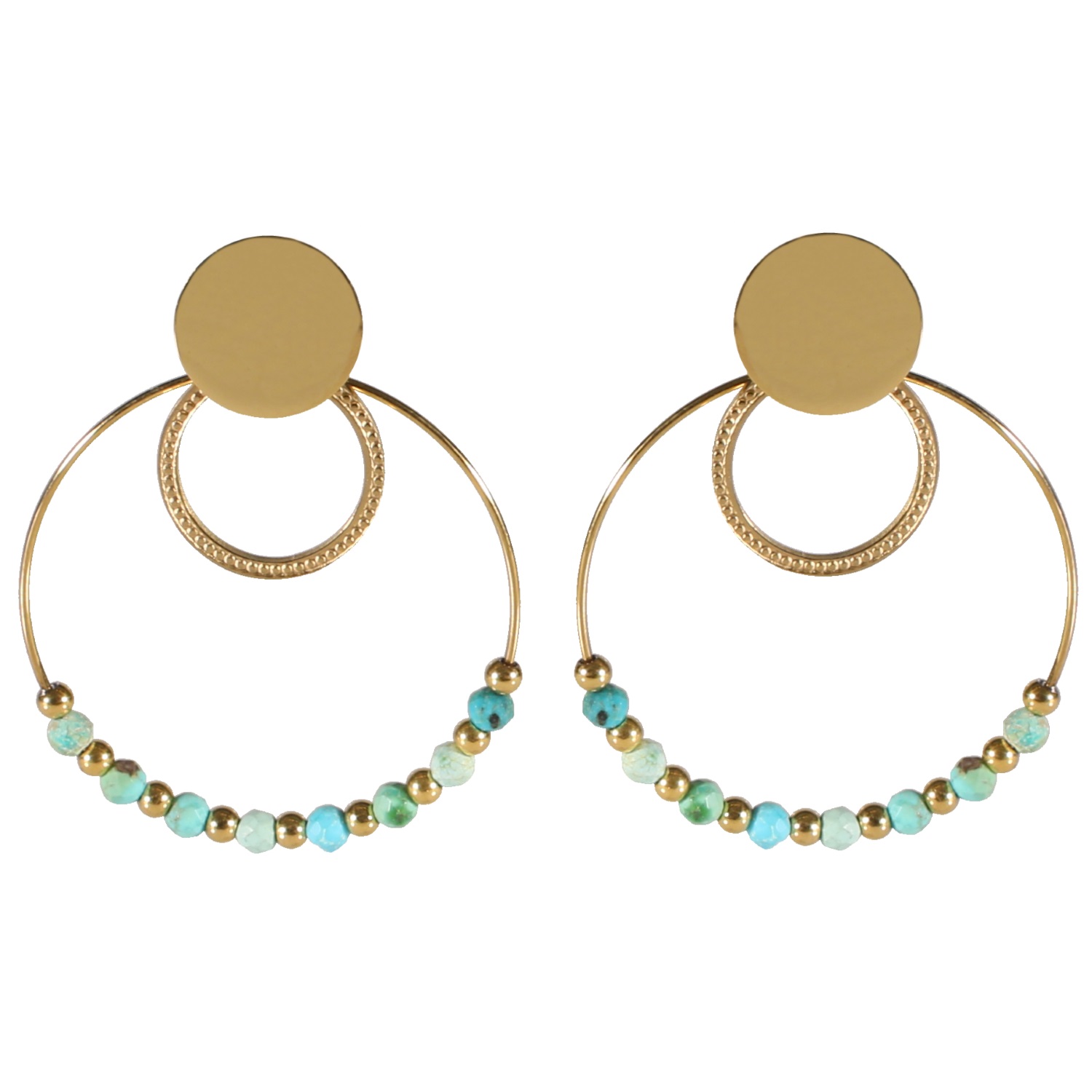 Boucles d'oreilles pendantes composées de puces rondes et double cercles en acier doré surmontés de perles en véritable pierre de pin africain.