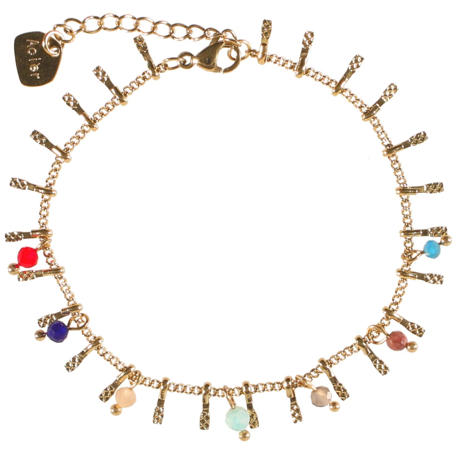Description Bracelet avec pampilles en acier doré et perles de couleur. Fermoir mousqueton avec rallonge de 3 cm. Cliquez sur une matière, un thème, une couleur ou une collection pour voir tous les articles associés.