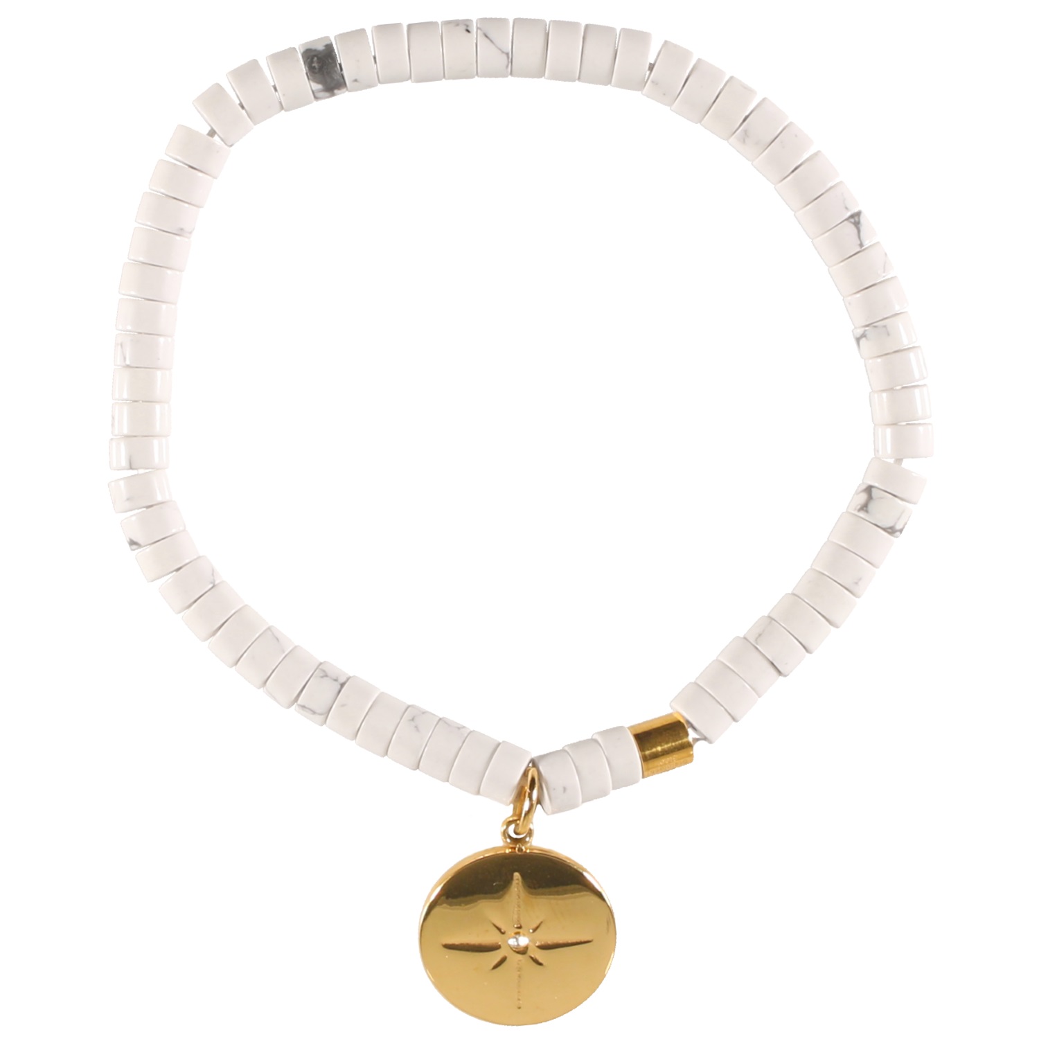 Bracelet élastique composé de perles cylindriques en pierre de couleur blanche et un pendant rond avec le motif d'une étoile surmontée d'un cristal en verre.