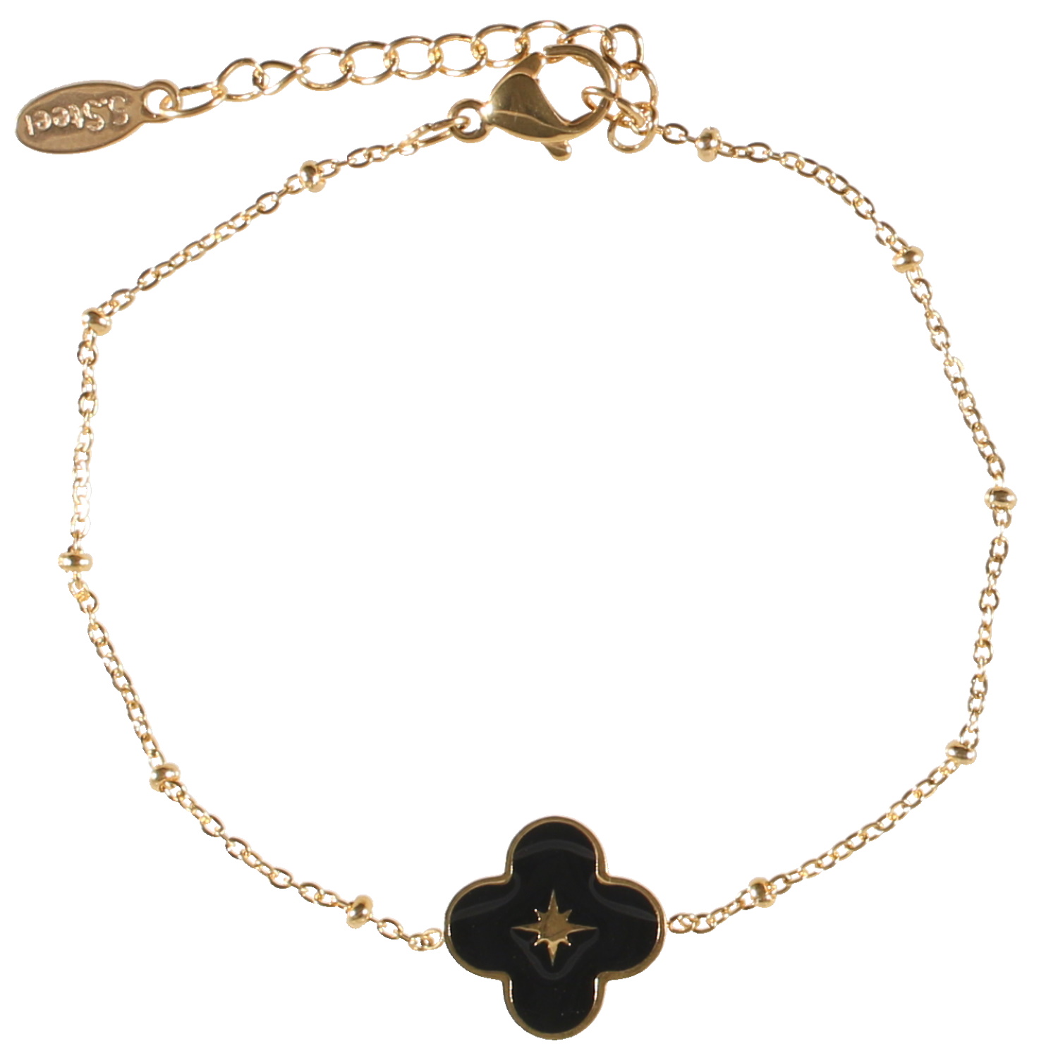 Bracelet composé d'une chaîne en acier doré et d'un trèfle à quatre feuilles pavé d'émail de couleur noire avec une étoile en acier doré.