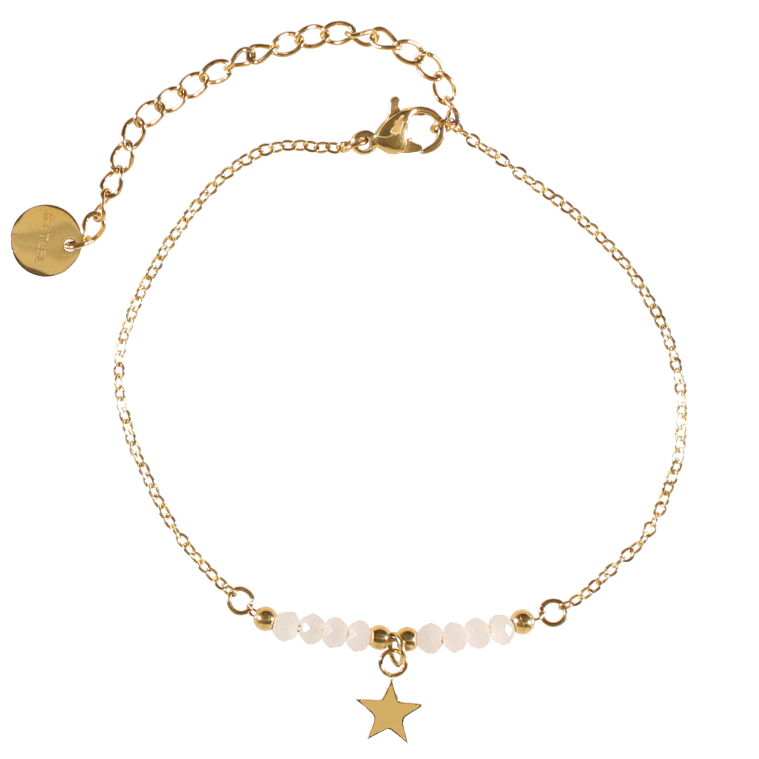 Description Bracelet composé d'une chaîne en acier doré, de perles de couleur blanche et d'une étoile en acier doré. Fermoir mousqueton avec 5 cm de rallonge. Cliquez sur une matière, un thème, une couleur ou une collection pour voir tous les articles associés.