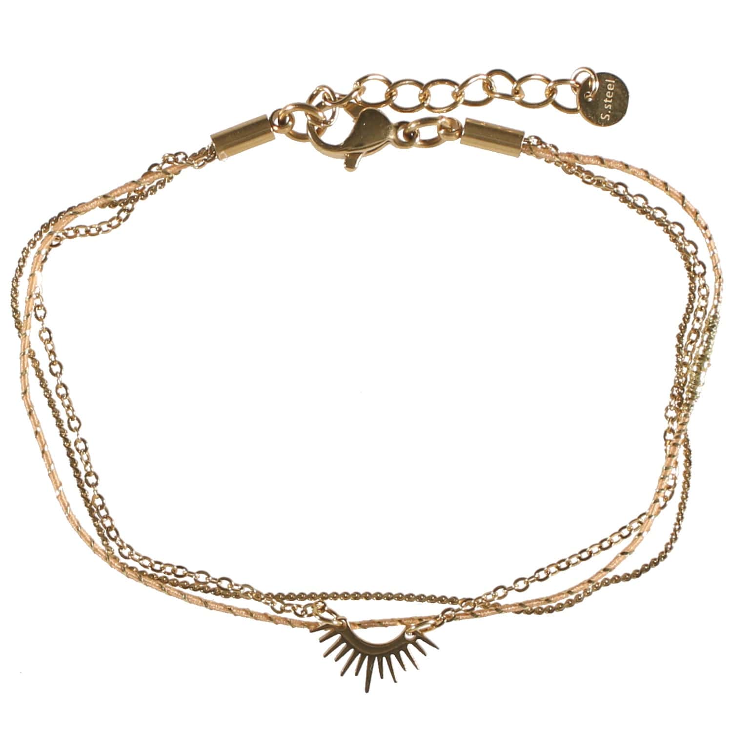 Bracelet triple rangs composé d'un bracelet en textile et fil doré, une chaîne en acier doré et une chaîne avec demi rayons de soleil en acier doré.