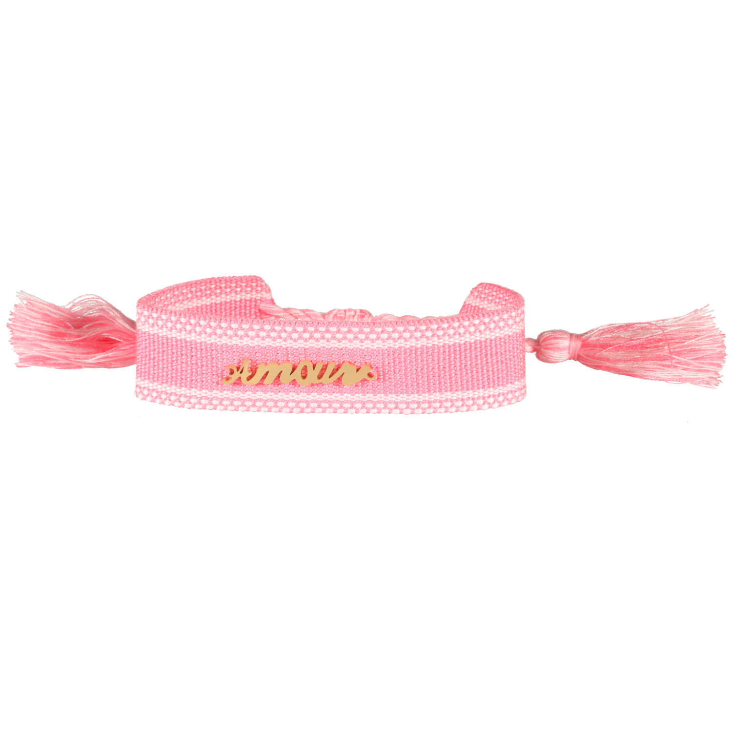 Bracelet cordon large en textile de couleur rose et blanche avec le mot Amour en acier doré.