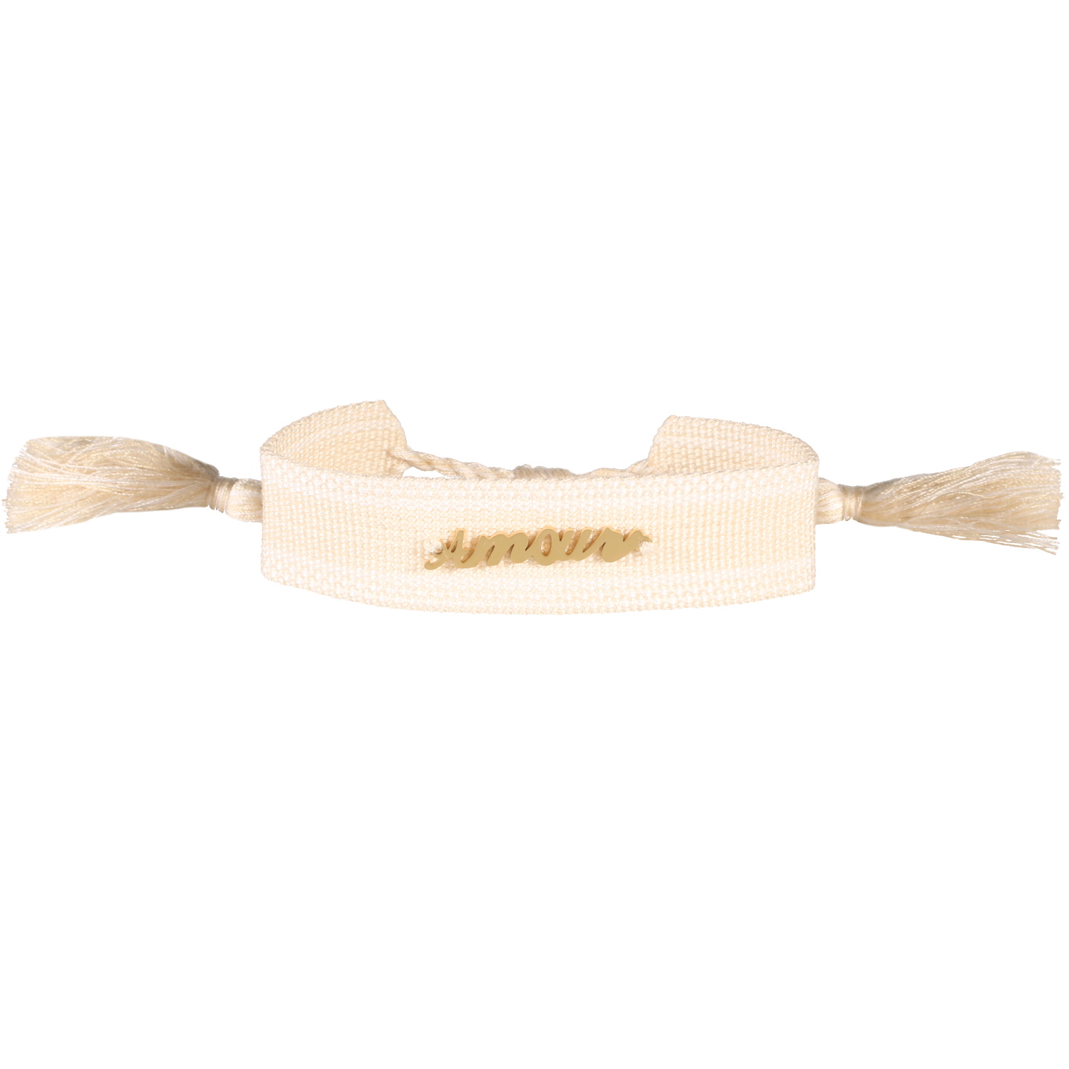 Bracelet cordon large en textile de couleur blanche avec le mot Amour en acier doré.