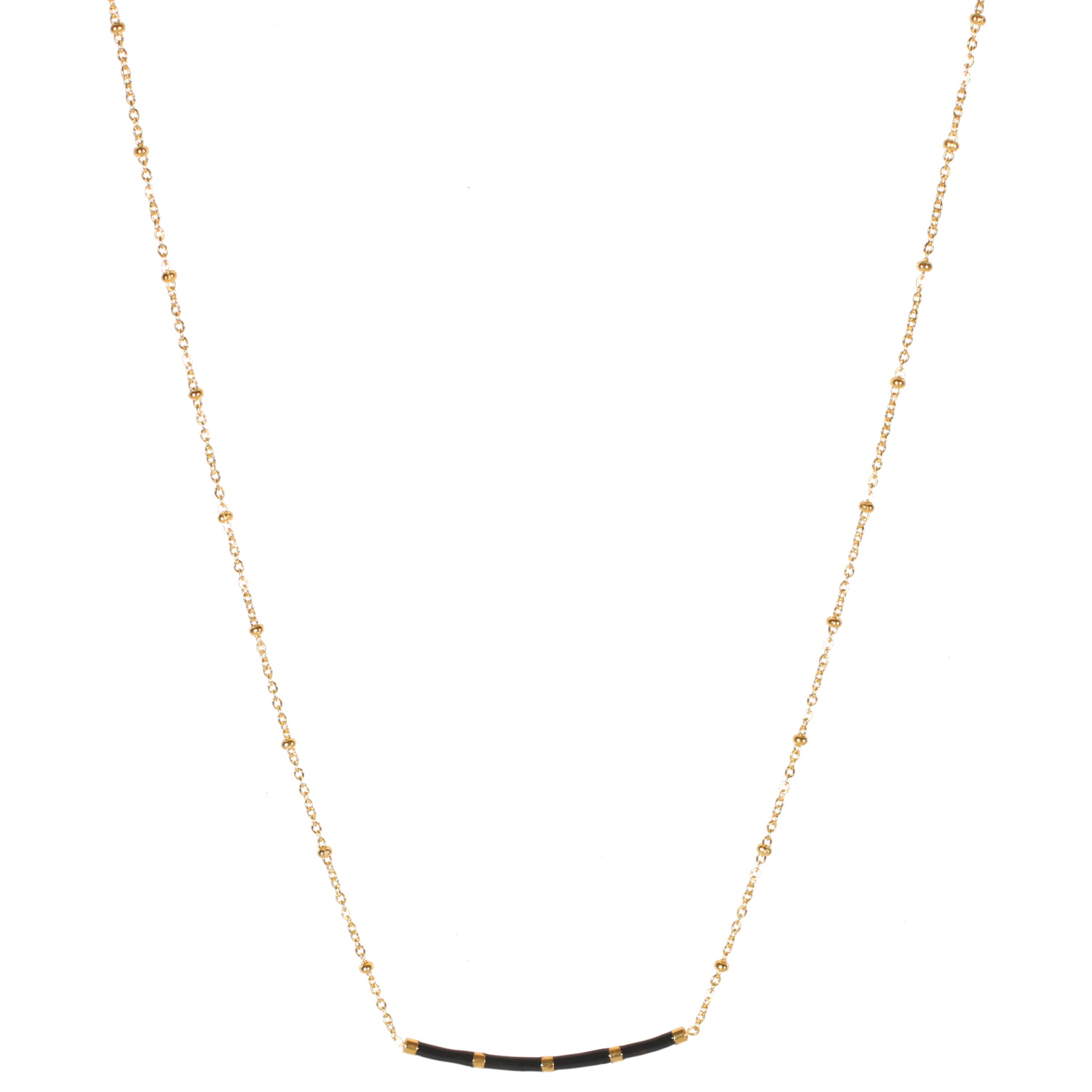 Description Collier composé d'une chaîne en acier doré et de perles cylindriques en matière synthétique de couleur noire. Fermoir mousqueton avec 5 cm de rallonge. Longueur 41+5 cm [Guide des tailles] Largeur 2 mm Matière(s) Acier , Résine . L'acier utilisé dans la bijouterie existe sous plusieurs qualités. Nous utilisons principalement la qualité 316L, qualité qui est utilisée en chirurgie. Cet acier est donc inoxydable et reste très résistant. Fermoir Mousqueton Couleur(s) dominante(s) Doré , Noir Public Adolescent , Adulte . Genre Femme , Fille . Saison Indémodable . Cliquez sur une matière, un thème, une couleur ou une collection pour voir tous les articles associés.