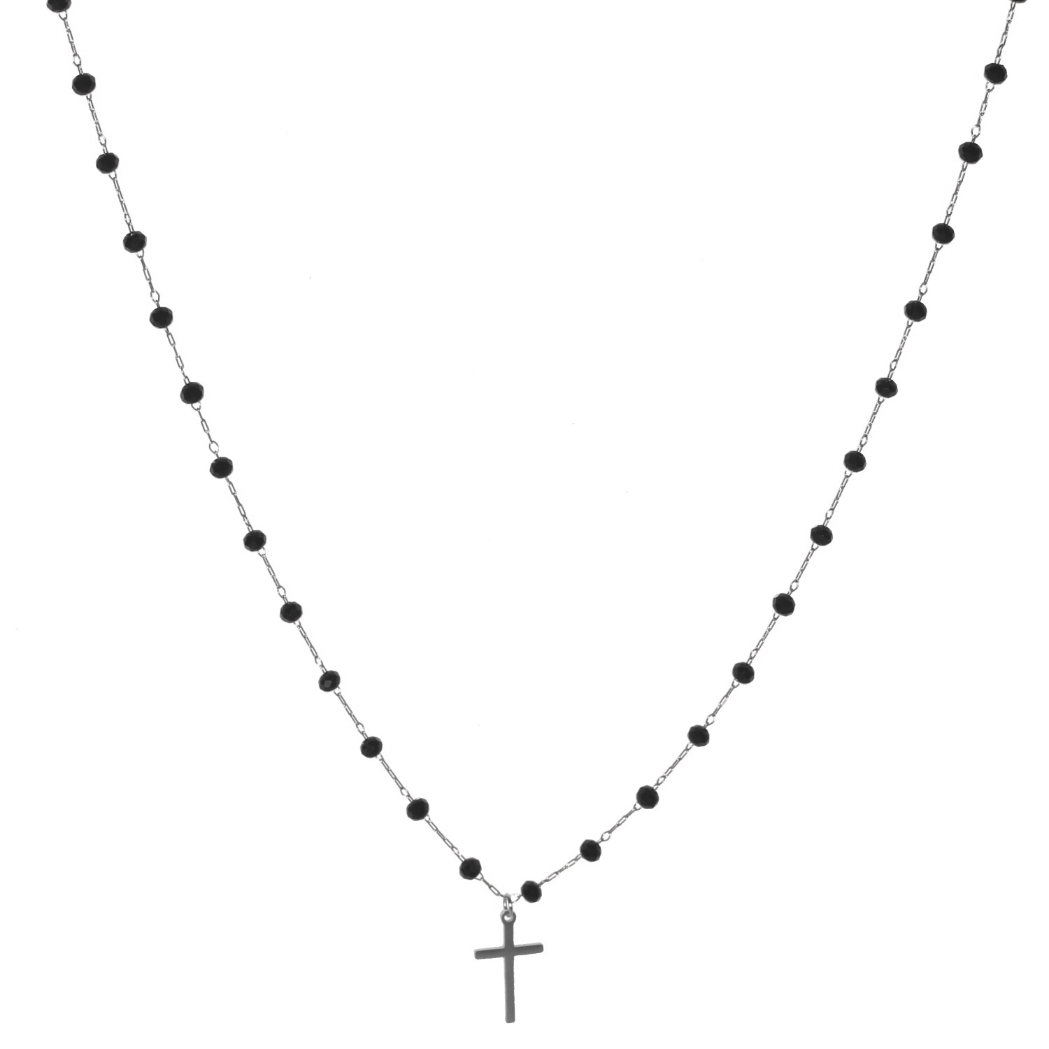 Collier composé d'une chaîne en acier argenté, de perles de couleur noire et d'un pendentif en forme de croix en acier argenté.