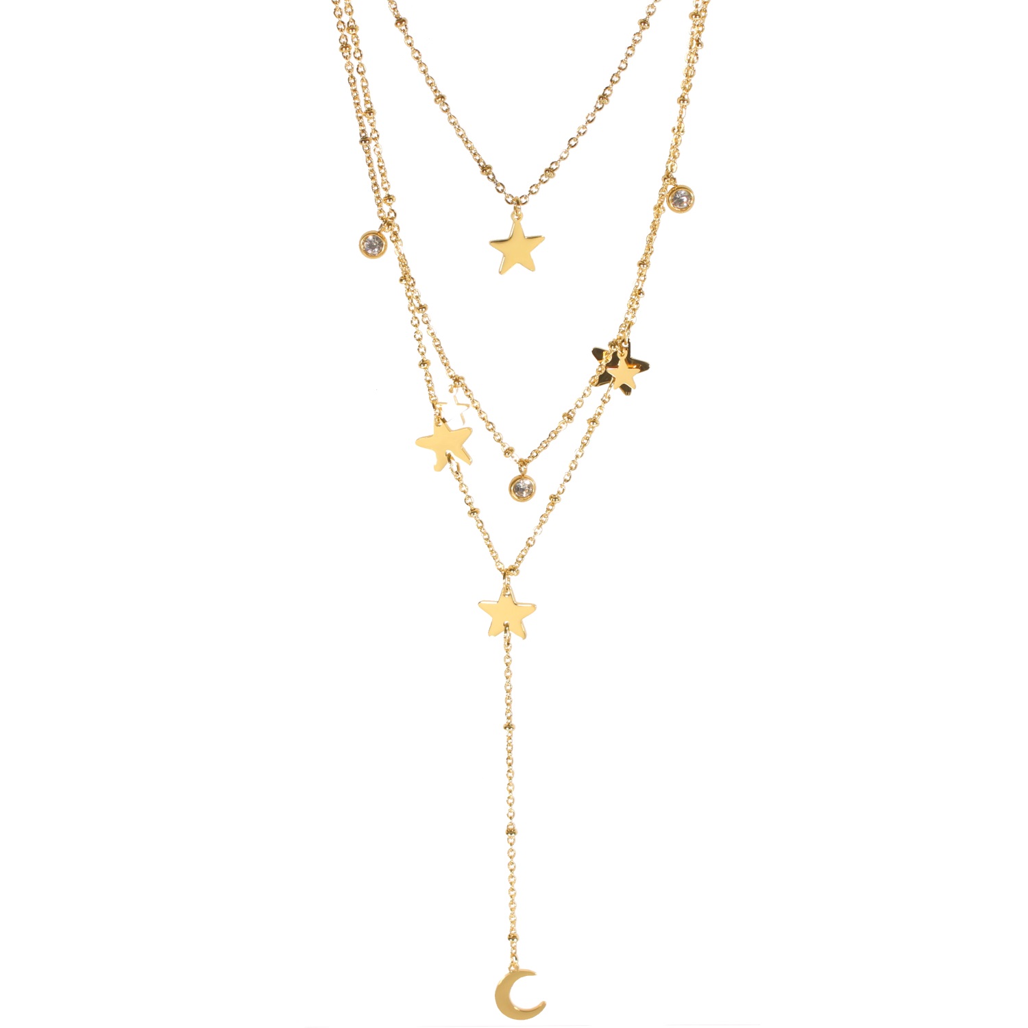 Description Collier triple rangs avec étoiles et croissant de lune en acier doré et pampilles en verre. Cliquez sur une matière, un thème, une couleur ou une collection pour voir tous les articles associés.