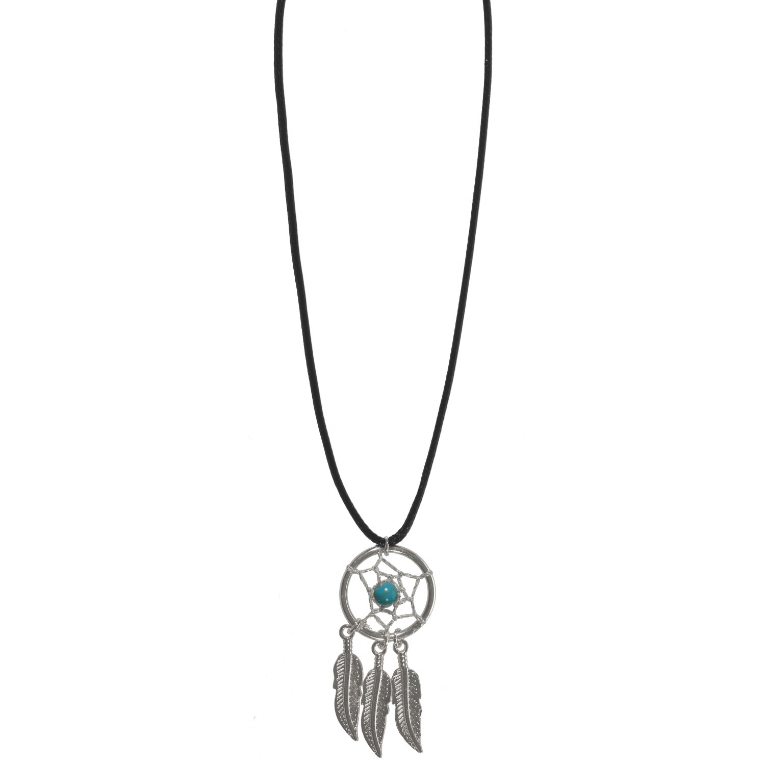Collier fantaisie Attrape-rêve en métal argenté, textile, rocaille et coton ciré.