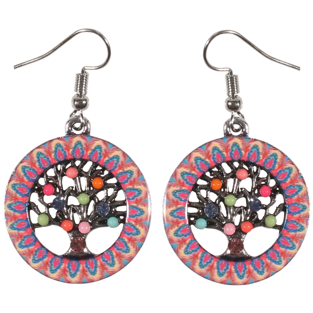 Boucles d'oreilles pendantes fantaisie Arbre de vie en métal argenté, émail et cristaux synthétiques.