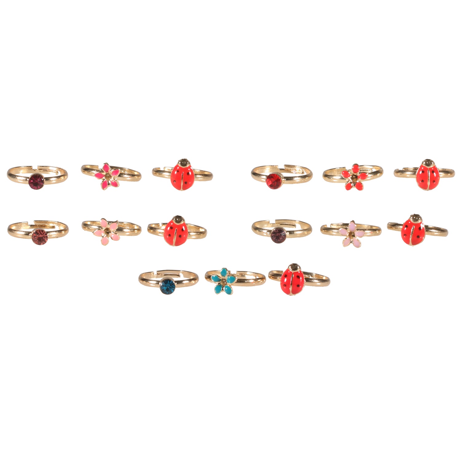 Lot de 3 bagues fantaisie pour enfant en métal doré, émail et cristaux synthétiques.