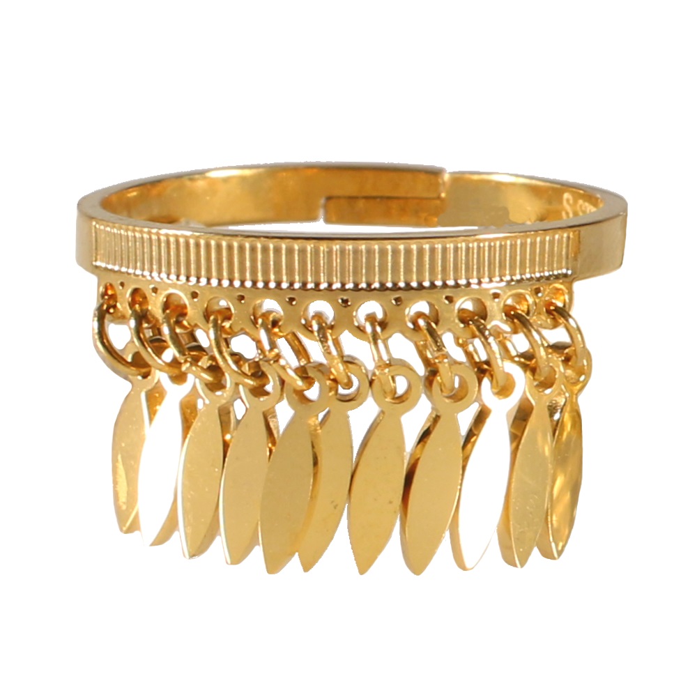 Description Bague anneau avec pendants en acier 316L doré. Taille ajustable. Largeur 12 mm Matière(s) Acier . L'acier utilisé dans la bijouterie existe sous plusieurs qualités. Nous utilisons principalement la qualité 316L, qualité qui est utilisée en chirurgie. Cet acier est donc inoxydable et reste très résistant. Fermoir Aucun Couleur(s) dominante(s) Doré Public Adolescent , Adulte . Genre Femme , Fille . Saison Indémodable . Collection Les petites Indiennes Cliquez sur une matière, un thème, une couleur ou une collection pour voir tous les articles associés.