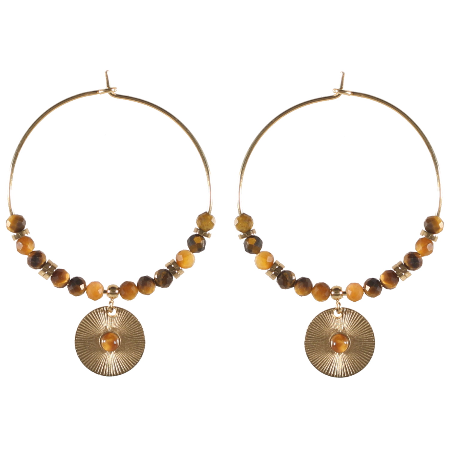 Boucles d'oreilles créoles en acier doré surmontées de perles de couleur en pierre naturelle et perles cylindriques en acier doré et d'un pendant rond aux motifs de rayons en acier doré surmonté d'une pierre naturelle de couleur.