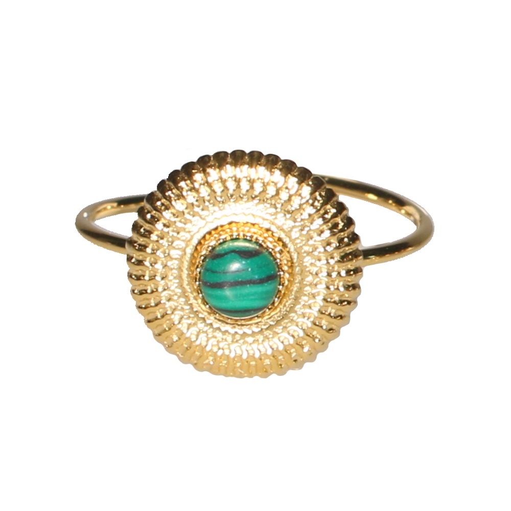 Bague en acier doré surmontée d'une pastille ronde sertie d'un cabochon en véritable pierre de malachite.