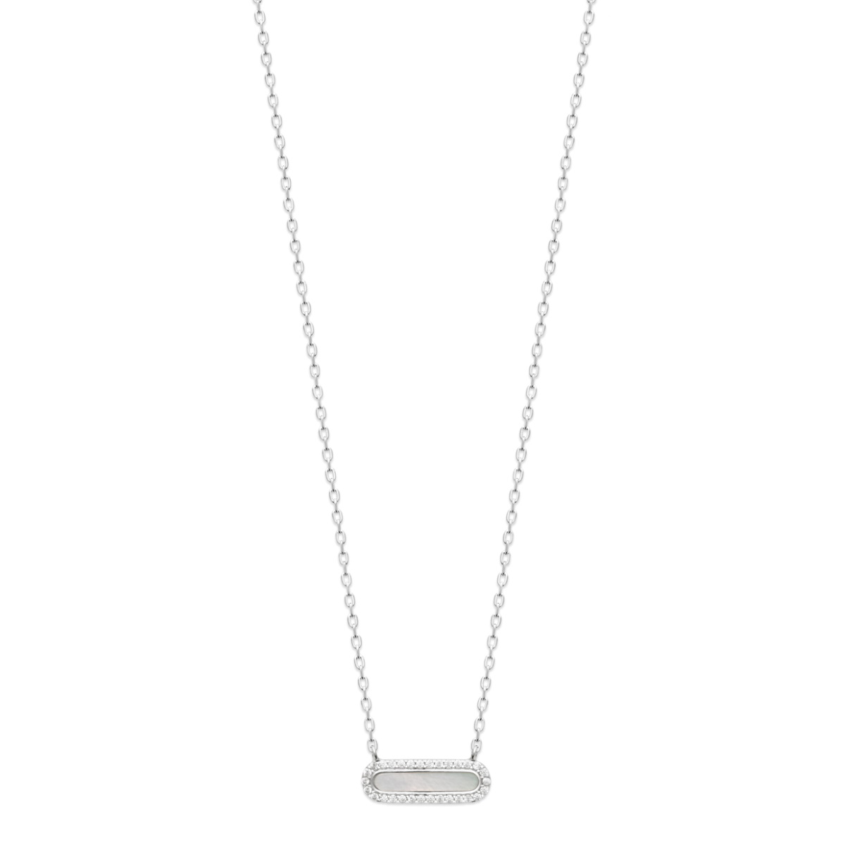 Collier composé d'une chaîne en argent 925/000 rhodié et d'un pendentif pastille rectangulaire arrondie pavée d'une barre de nacre entourée d'un pavage d'oxydes de zirconium blancs.