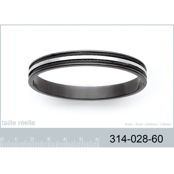 Bracelet rigide en acier, acier ruthénié et câbles.