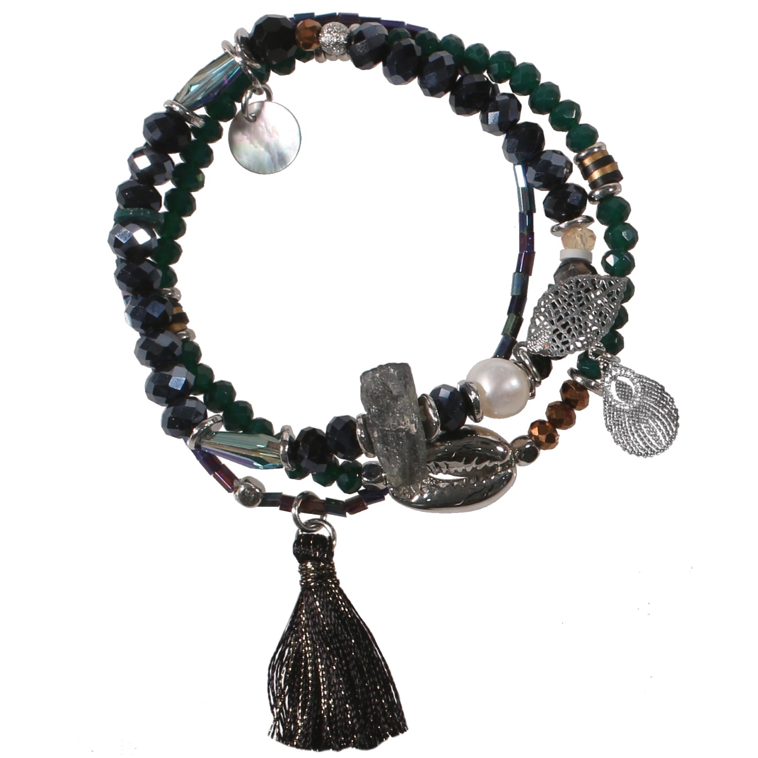 - Matière(s) Caoutchouc, Métal, Métal argenté, Nacre, Pierre naturelle, Rocaille, Textile