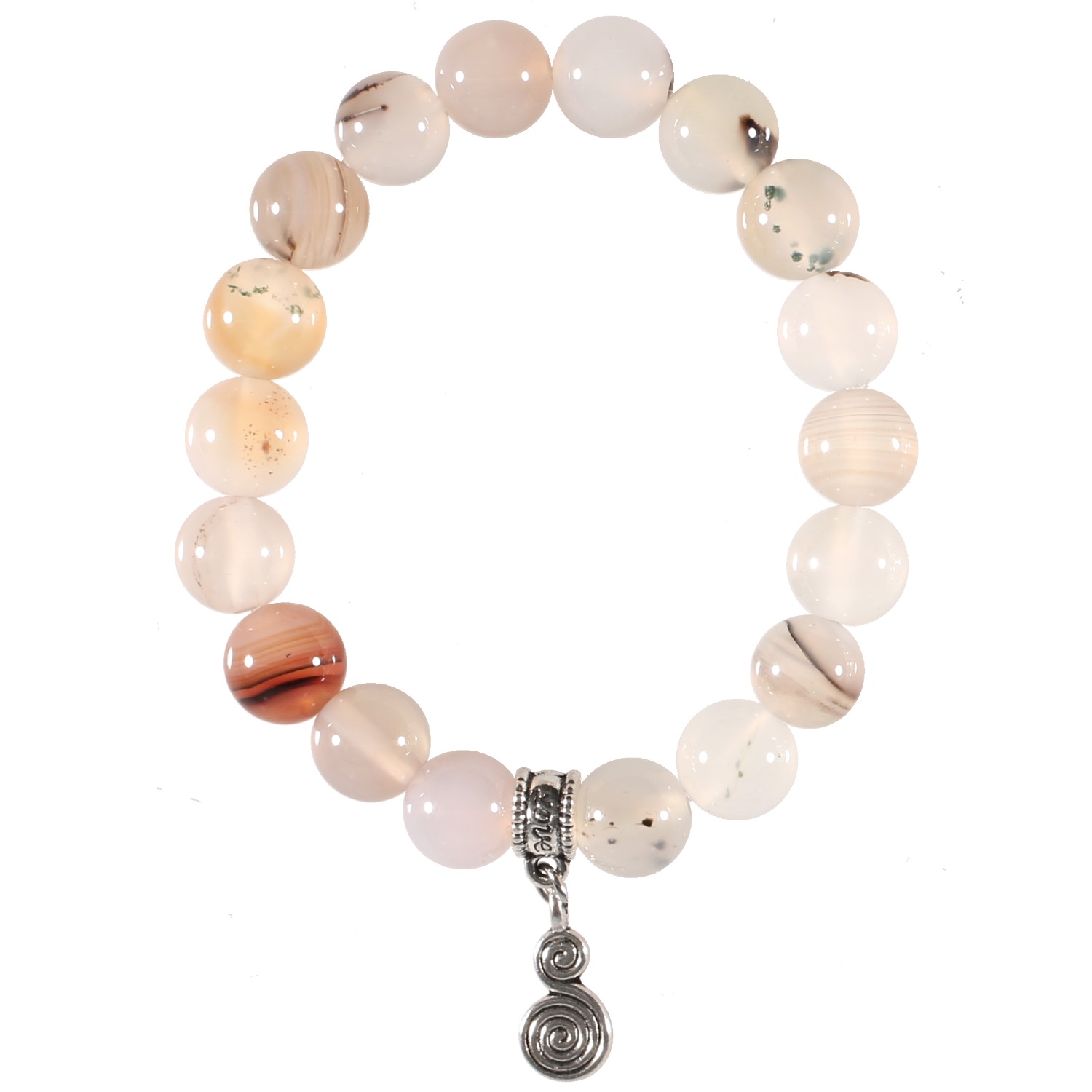 Bracelet élastique avec spirale en métal argenté et boules en pierre calcédoine océane.