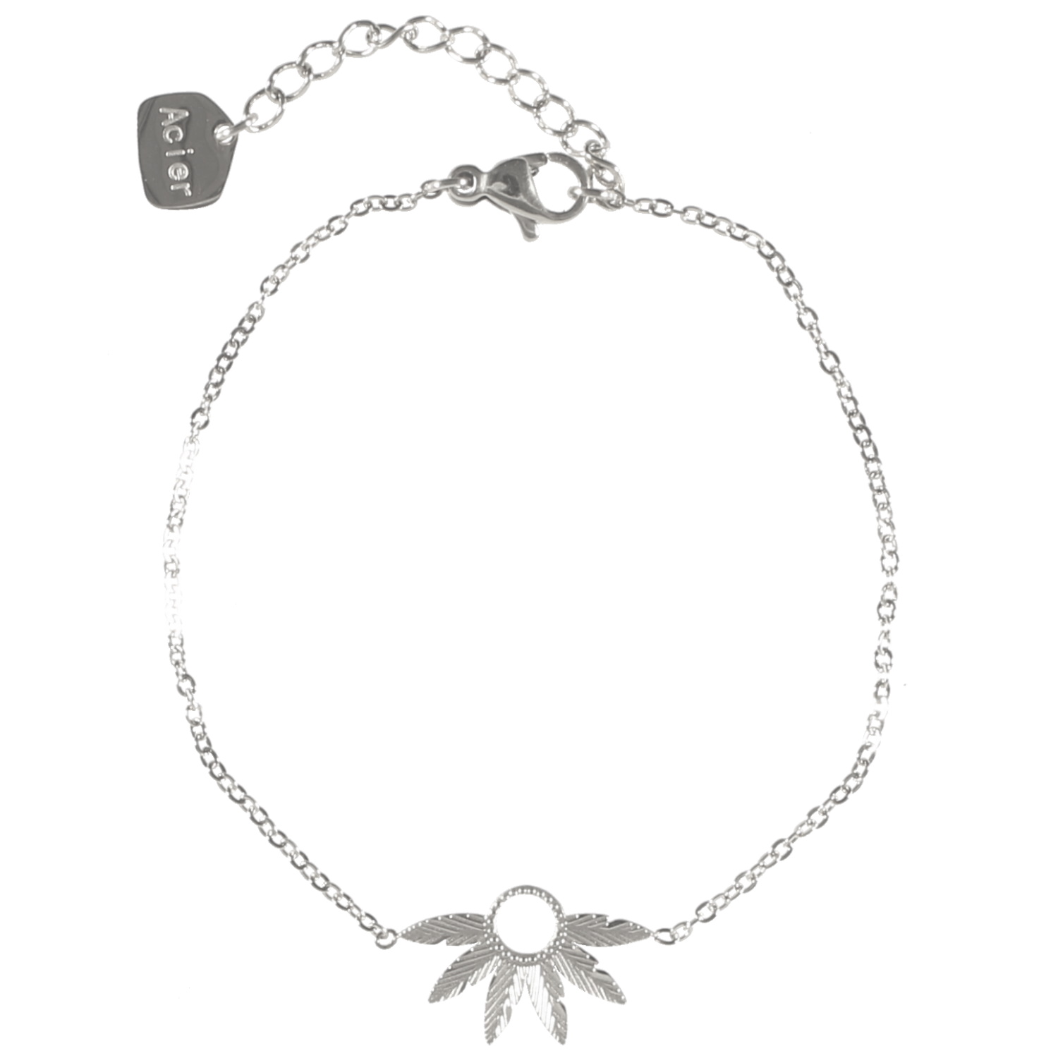 Description Bracelet composé d'une chaîne en acier argenté et d'un cercle avec 6 plumes en acier argenté. Fermoir mousqueton avec rallonge de 3 cm. Cliquez sur une matière, un thème, une couleur ou une collection pour voir tous les articles associés.