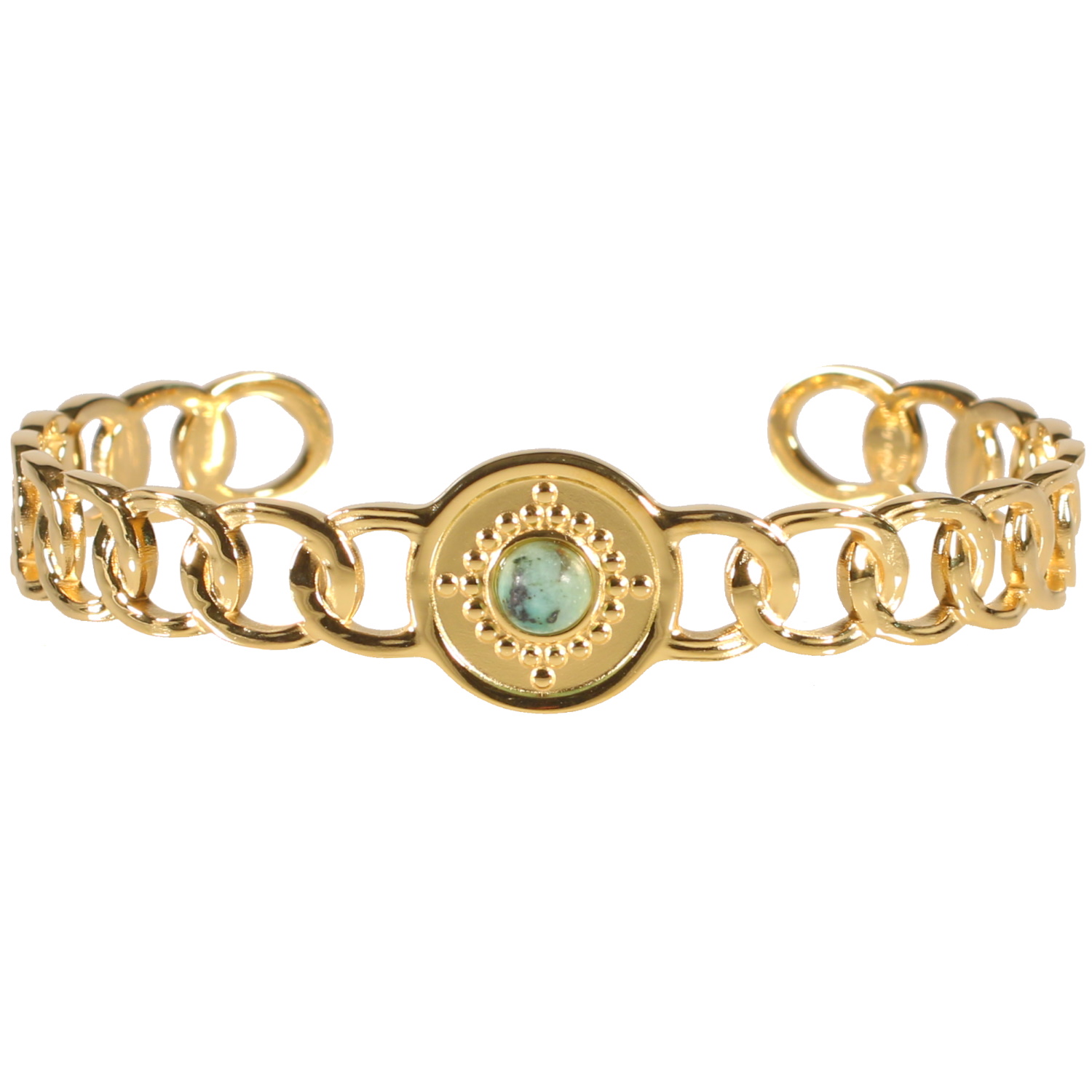 Bracelet jonc rigide au motif de chaîne en acier doré surmonté d'une véritable pierre de turquoise d'Afrique sertie clos de forme ronde.