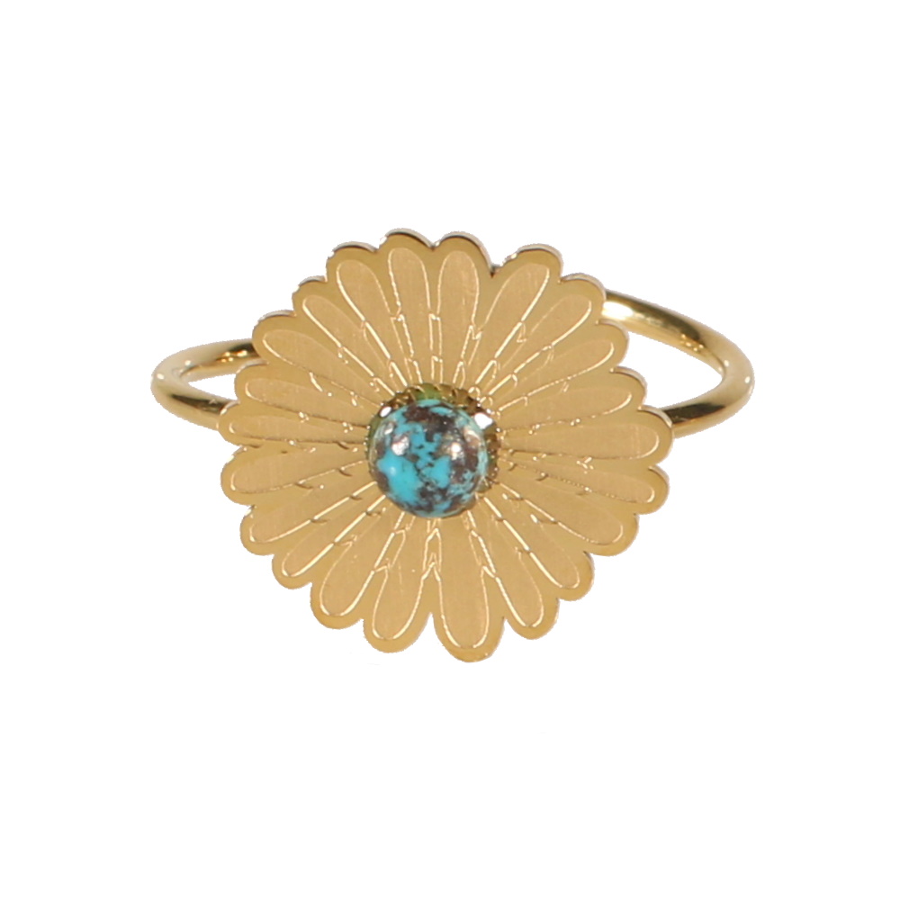 Bague surmontée d'une fleur en acier doré serti clos d'une véritable pierre de turquoise d'Afrique de forme ronde.
