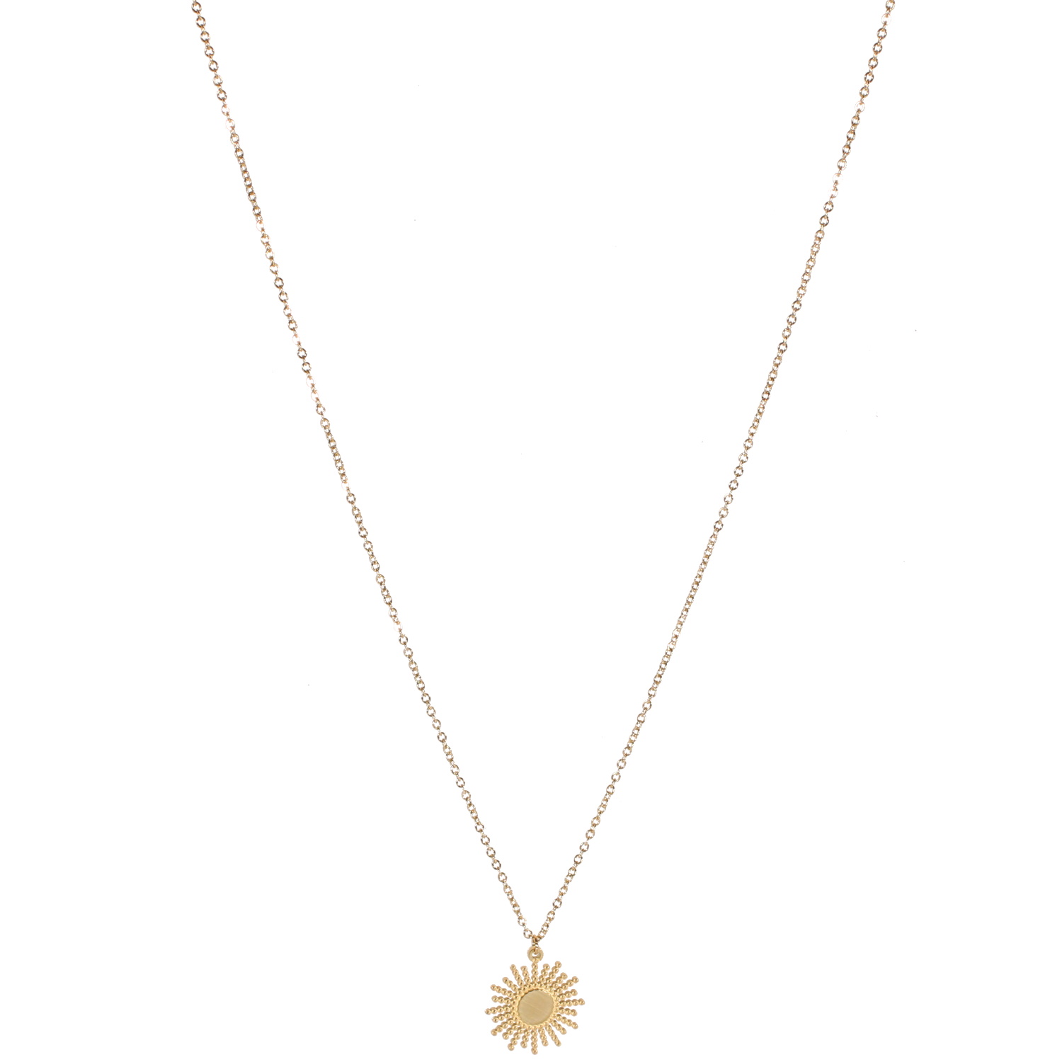 Description Collier composé d'une chaîne avec pastille ronde au motif de soleil en acier doré. Fermoir mousqueton avec 7 cm de rallonge. Longueur 39+7 cm [Guide des tailles] Matière(s) Acier . L'acier utilisé dans la bijouterie existe sous plusieurs qualités. Nous utilisons principalement la qualité 316L, qualité qui est utilisée en chirurgie. Cet acier est donc inoxydable et reste très résistant. Fermoir Mousqueton À noter Pendentif 15 mm de diamètre Couleur(s) dominante(s) Doré Public Adolescent , Adulte . Genre Femme , Fille . Saison Indémodable . Thème(s) Nature . Cliquez sur une matière, un thème, une couleur ou une collection pour voir tous les articles associés.