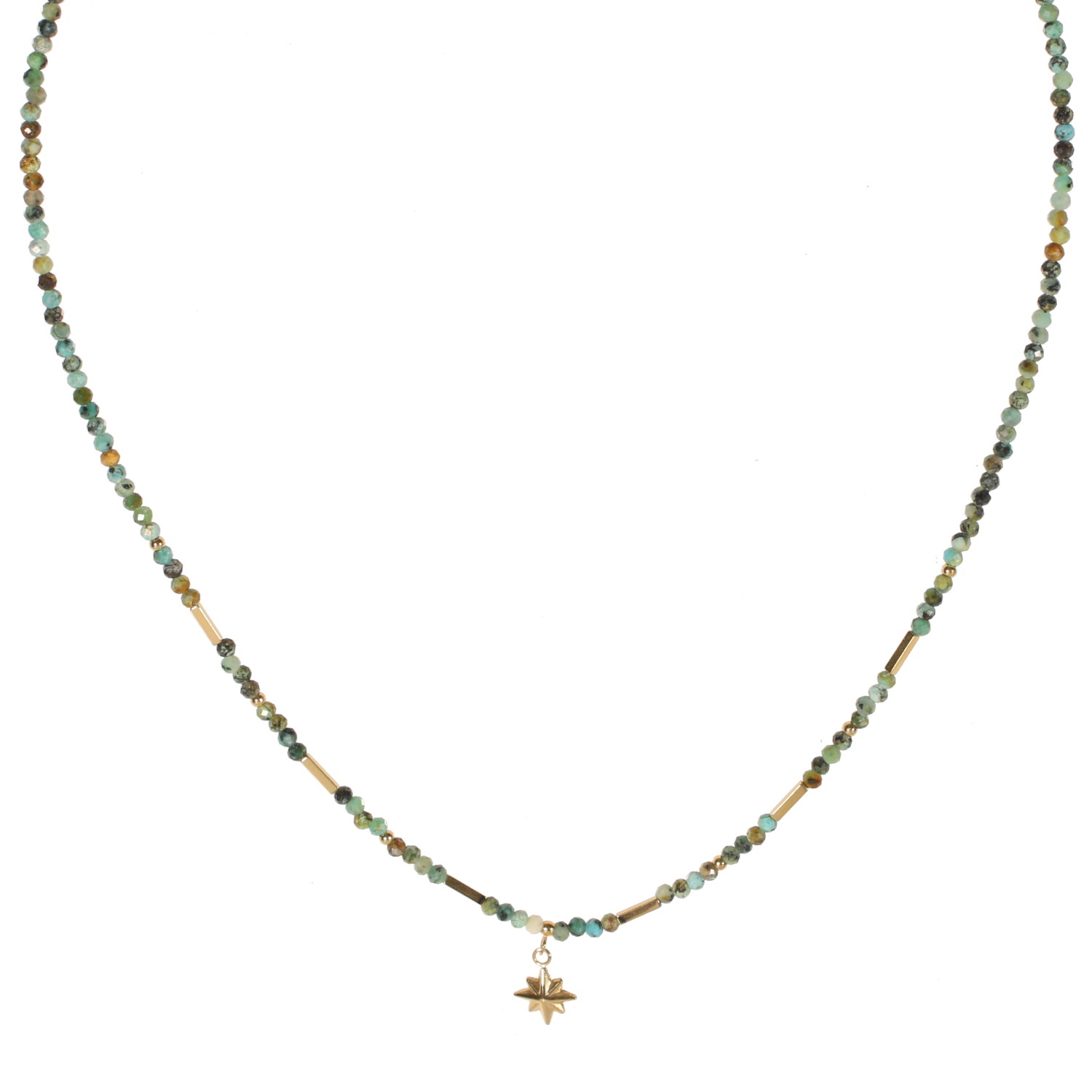 Collier composé de perles en véritable pierre de turquoise d'Afrique et un pendentif étoile en acier doré.