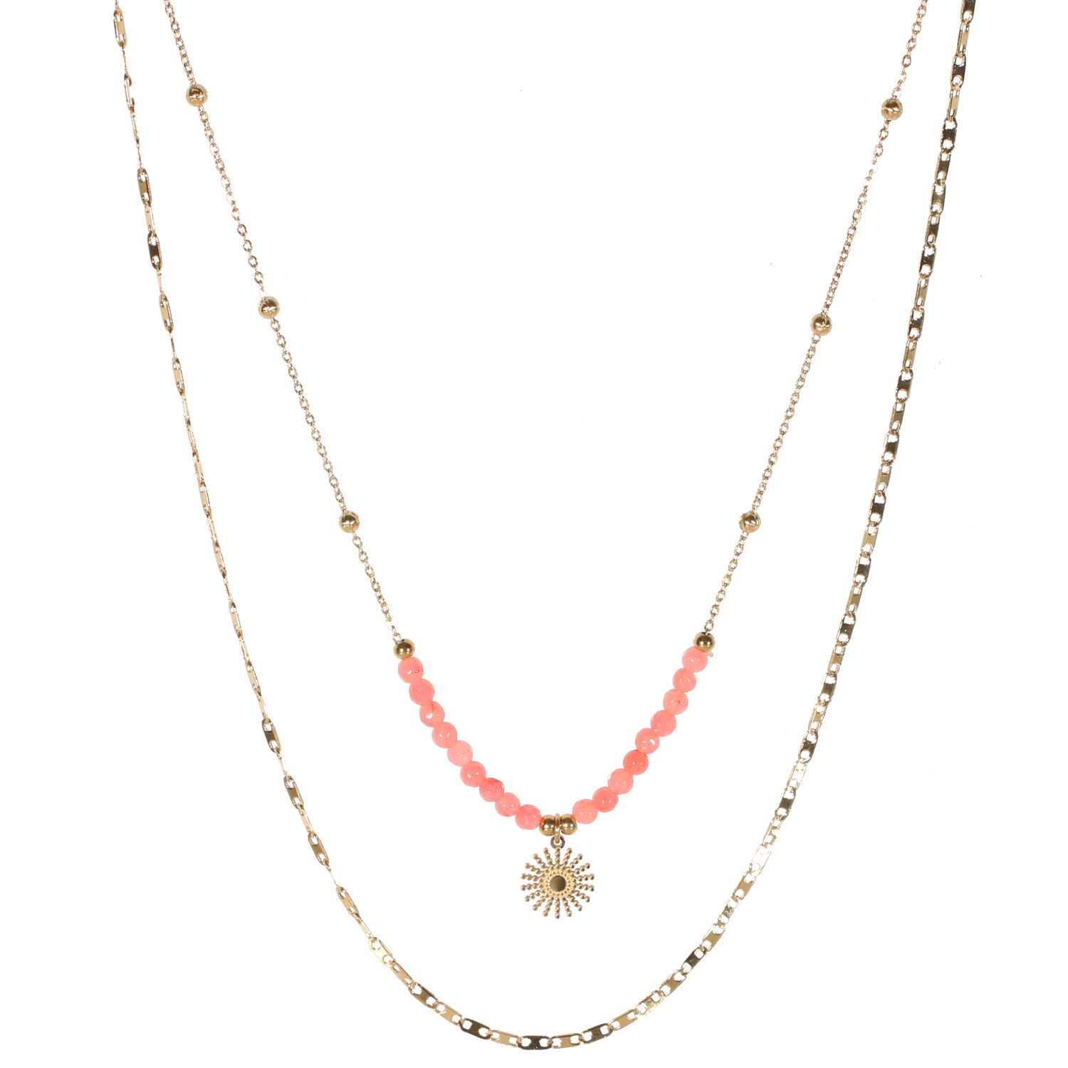 Collier double rangs composé d'une chaîne de 38 cm de long en acier doré surmontée de perles en véritable pierre de quartz rose et un pendentif soleil en acier doré, ainsi qu'une chaîne de 44 cm en acier doré.