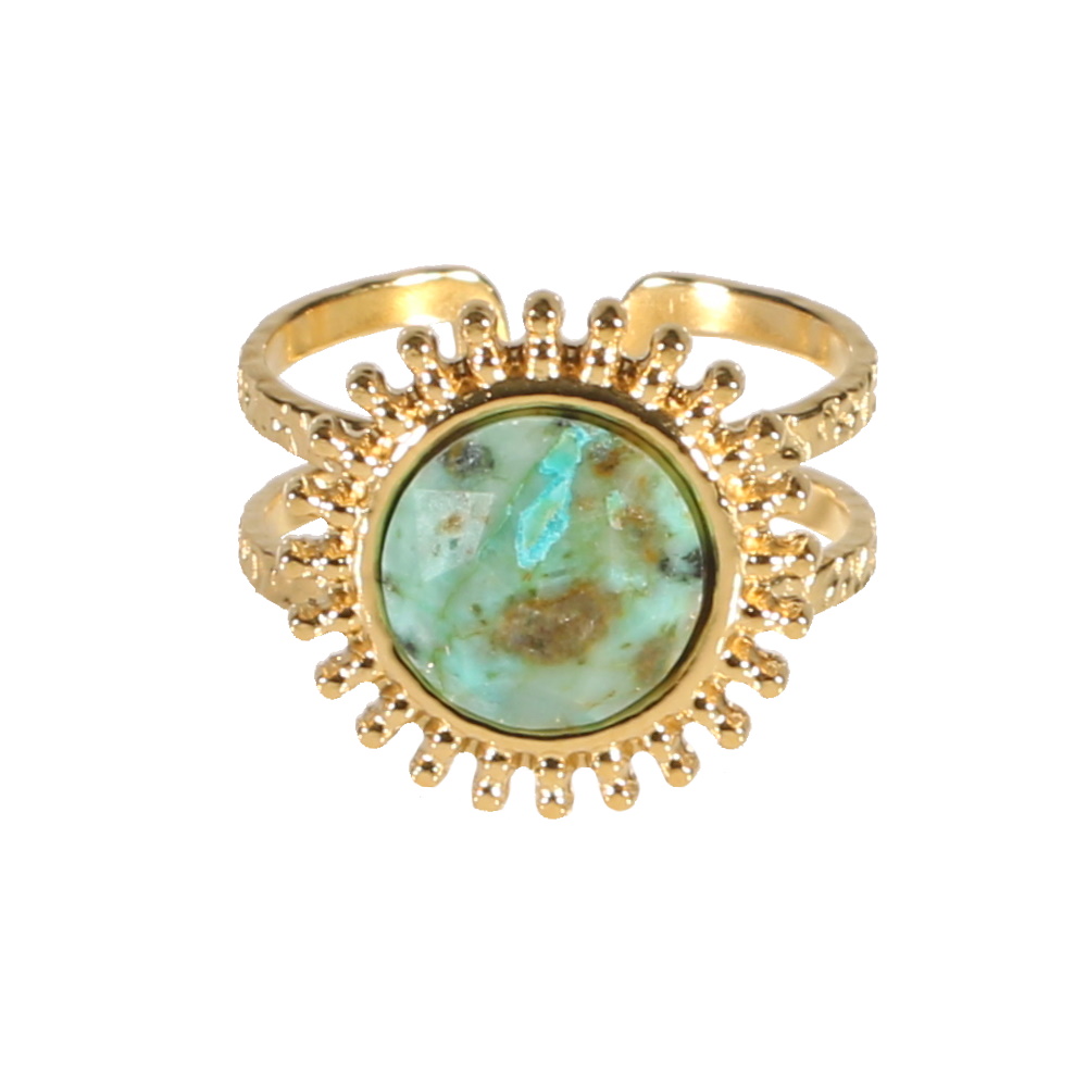 Bague double rangs surmontée d'un soleil en acier doré serti d'une véritable pierre turquoise d'Afrique.