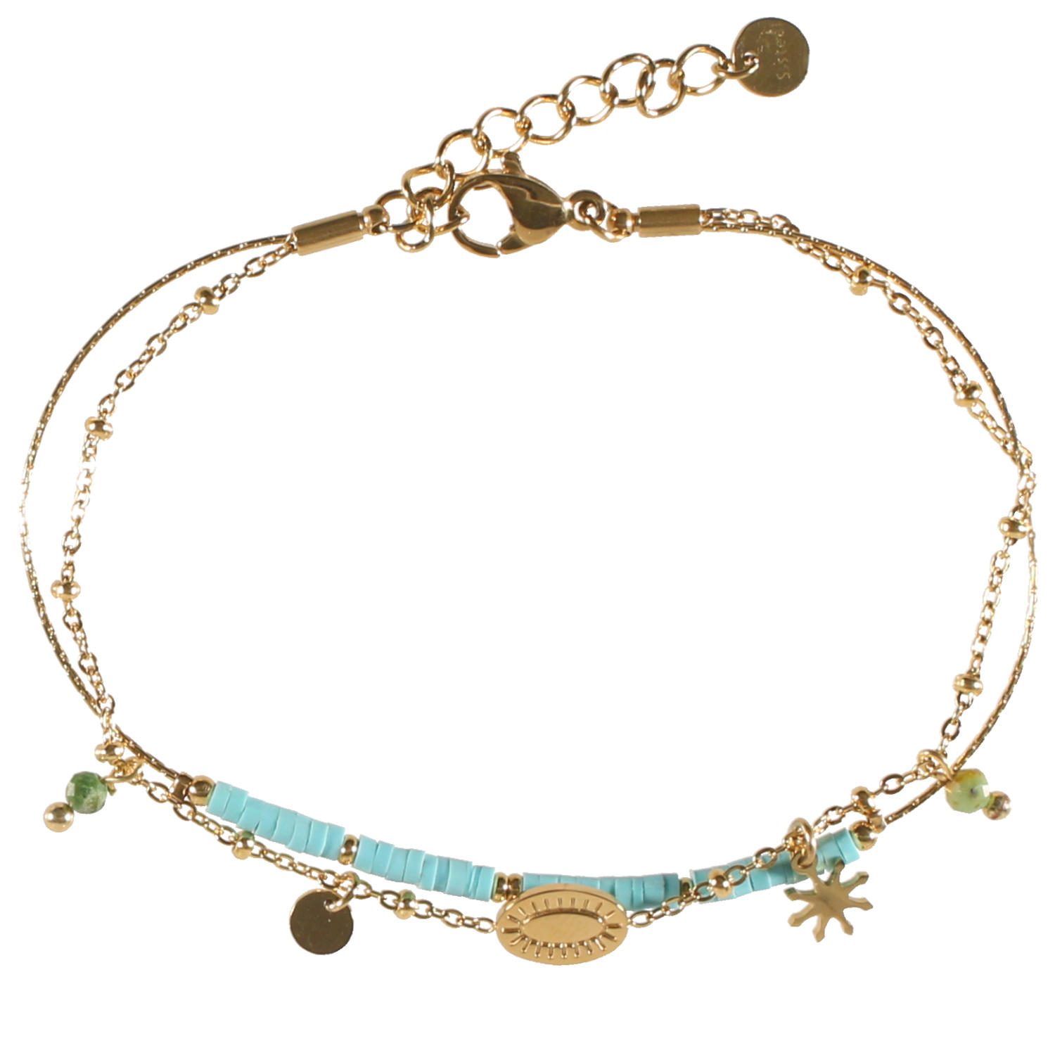 Bracelet double rangs composé d'une chaîne en acier doré surmontée de perles cylindriques en caoutchouc de couleur bleue, ainsi qu'une chaîne avec une pastille ovale représentant un œil de Turquie et des pendants étoile et pastille ronde en acier doré et de deux pampilles perles en véritable pierre de turquoise d'Afrique.