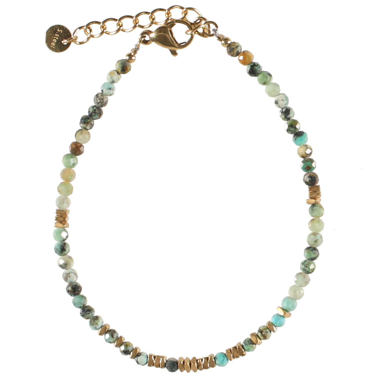 Bracelet avec perles en acier doré et perles en véritable pierre de turquoise d'Afrique.