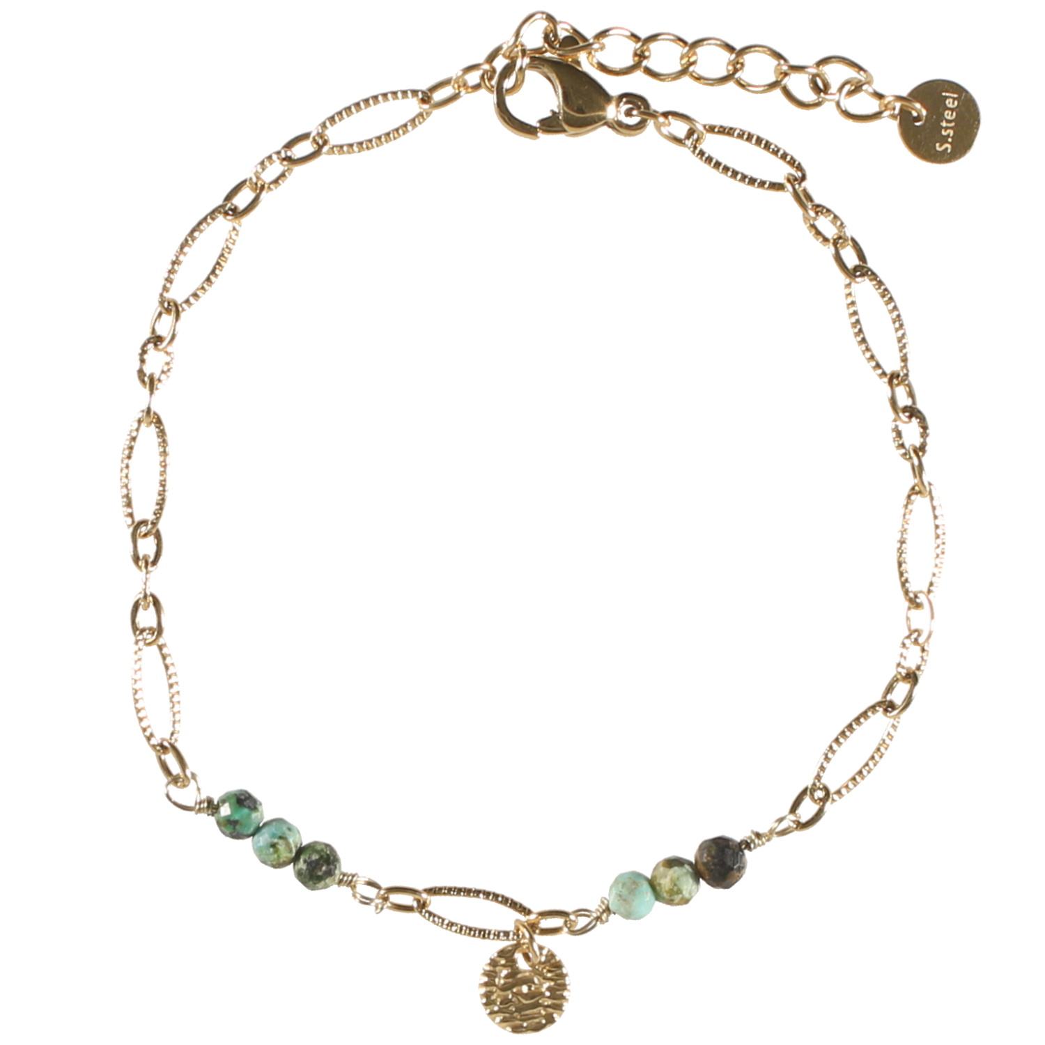Bracelet composé d'une chaîne avec une pastille ronde martelée en acier doré et de perles en véritable pierre de turquoise d'Afrique.