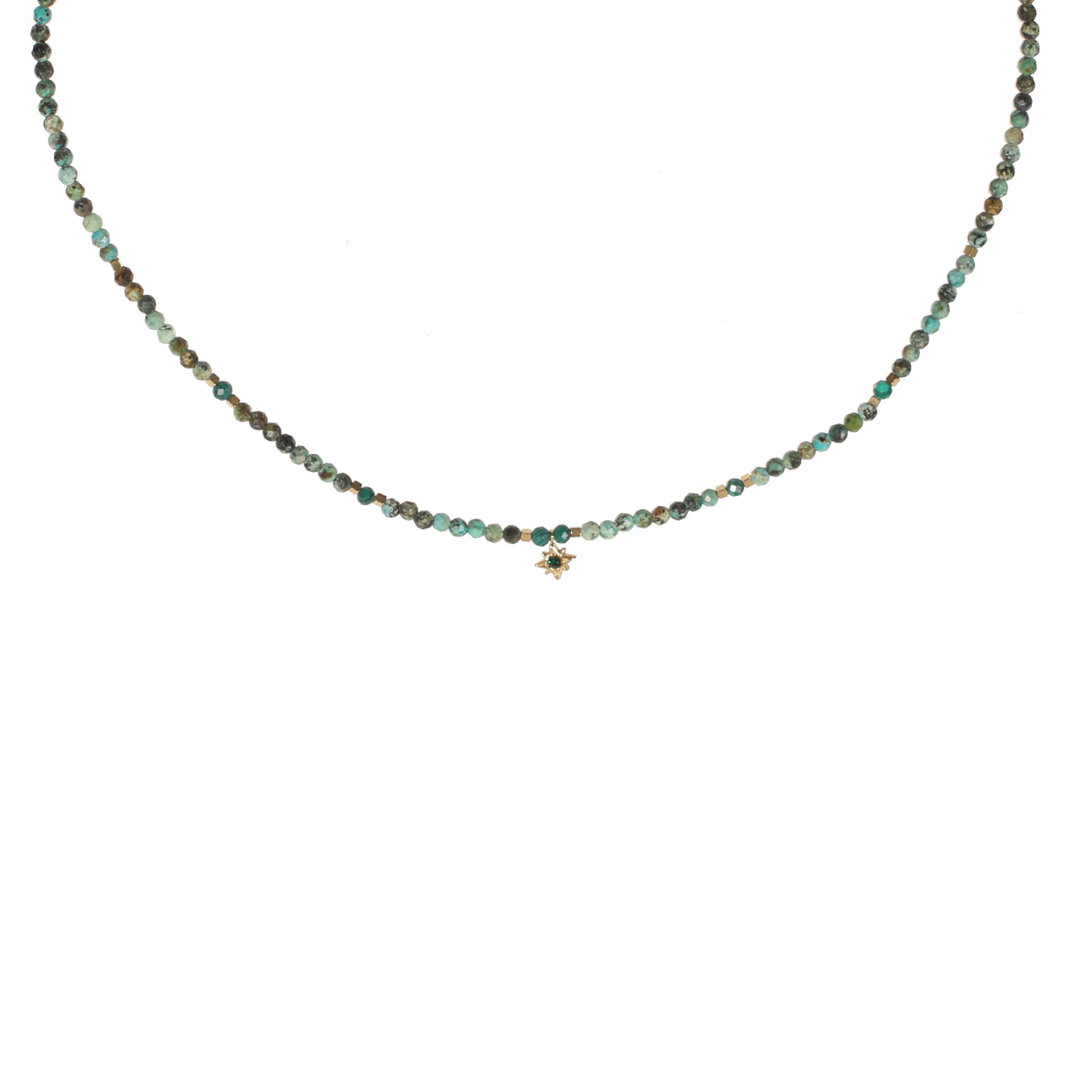 Collier composé de perles en véritable pierre de turquoise d'Afrique et d'un pendentif étoile en acier doré surmonté d'un cristal de couleur verte.