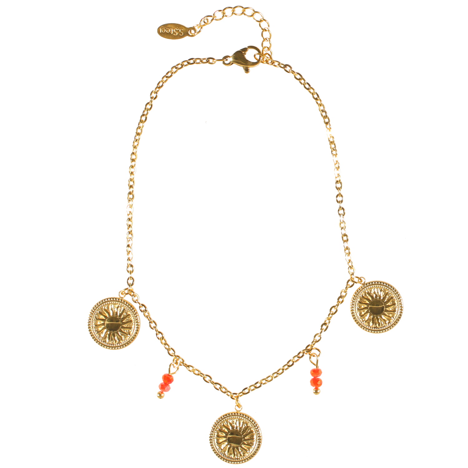 Description Bracelet chaîne de cheville composé d'une chaîne en acier doré, des pampilles de perles de couleur rouge et des pampilles rondes représentant un soleil en acier doré. Fermoir mousqueton avec 3 cm de rallonge. Cliquez sur une matière, un thème, une couleur ou une collection pour voir tous les articles associés.