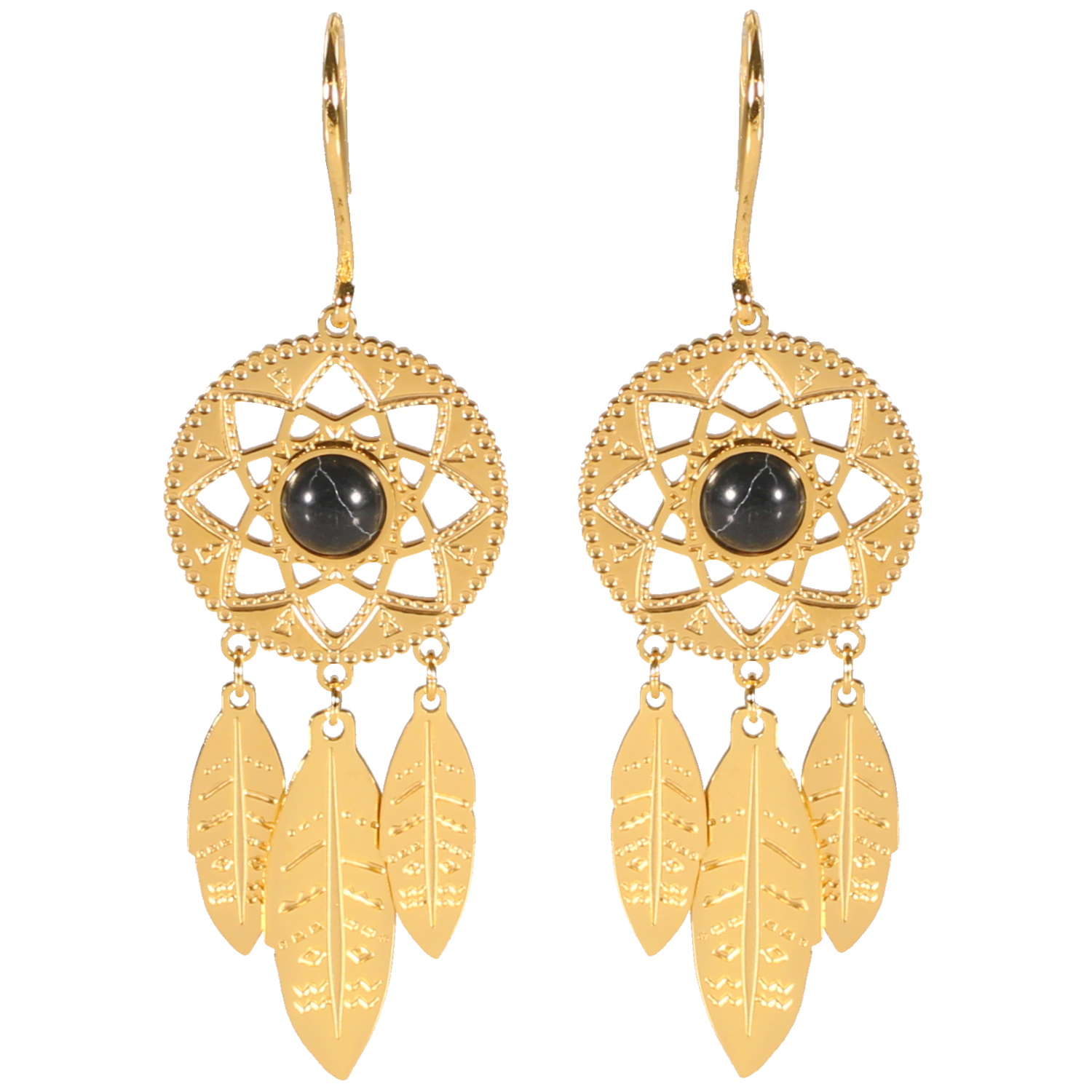 Description Boucles d'oreilles pendantes au motif d'attrape rêve en acier doré surmontées d'une pierre de couleur noire. Cliquez sur une matière, un thème, une couleur ou une collection pour voir tous les articles associés.