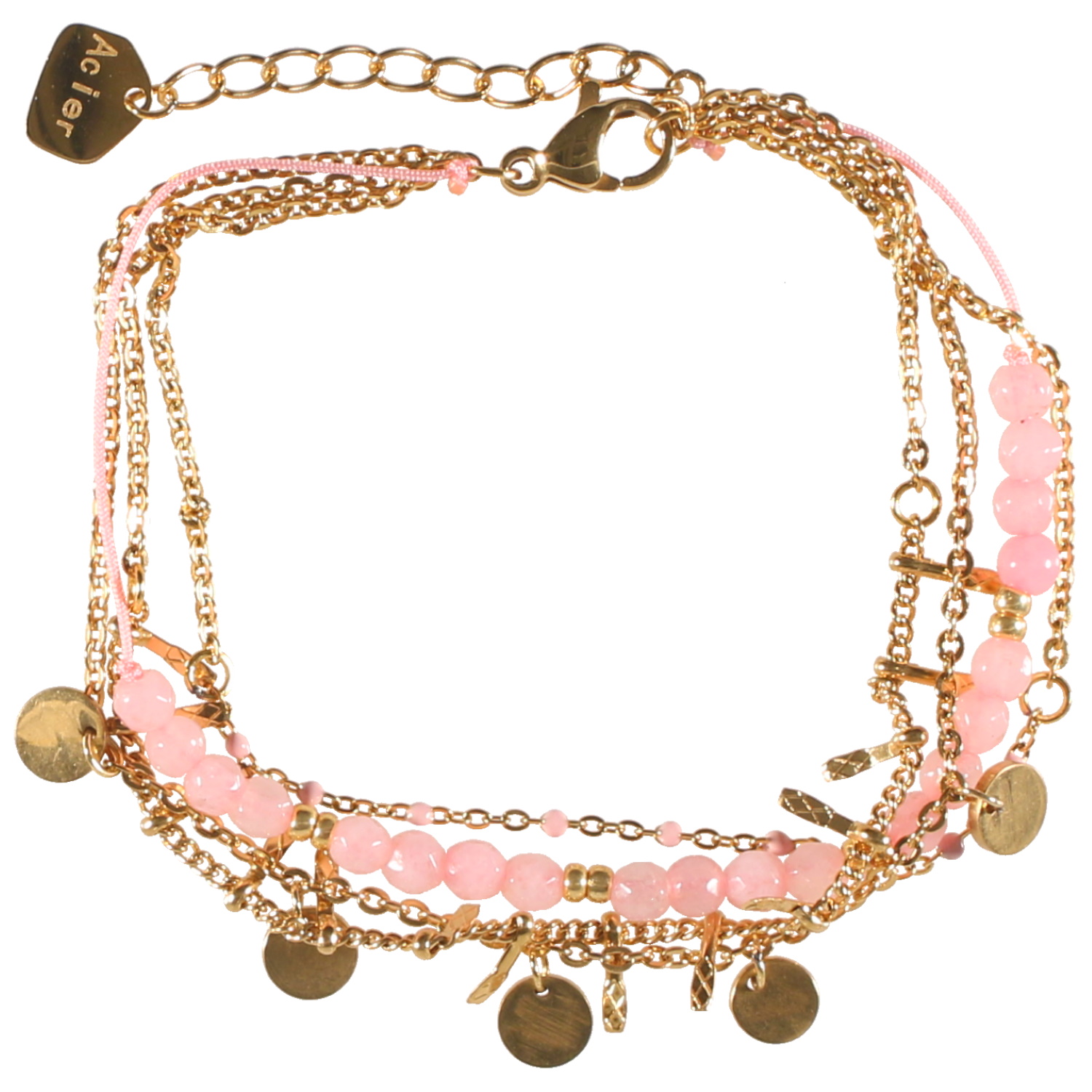 Bracelet quatre rangs composé d'une chaîne en acier doré avec perles en émail de couleur rose, une chaîne avec pampilles rondes en acier doré, une chaîne avec pampille en acier doré, ainsi qu'un cordon en coton avec perles en acier doré et perles en véritable pierre de quartz rose.