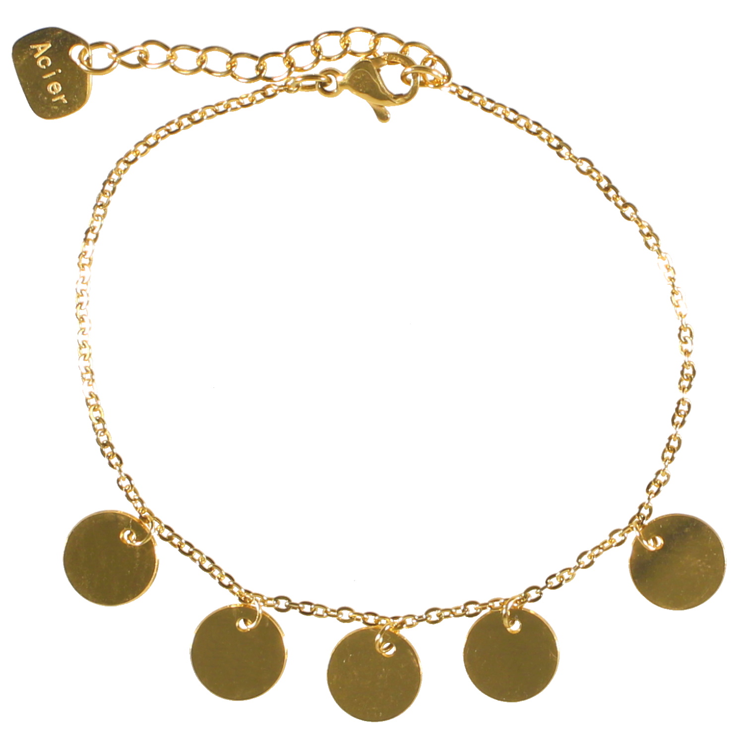 Description Bracelet composé d'une chaîne et de cinq pastilles rondes en acier doré. Fermoir mousqueton avec 3 cm de rallonge. Longueur 15.5+3 cm [Guide des tailles] Largeur 9 mm Matière(s) Acier . L'acier utilisé dans la bijouterie existe sous plusieurs qualités. Nous utilisons principalement la qualité 316L, qualité qui est utilisée en chirurgie. Cet acier est donc inoxydable et reste très résistant. Fermoir Mousqueton Couleur(s) dominante(s) Doré Public Adolescent , Adulte . Genre Femme , Fille . Saison Indémodable . Cliquez sur une matière, un thème, une couleur ou une collection pour voir tous les articles associés.