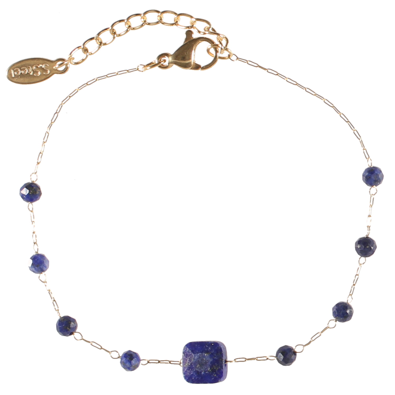 Description Bracelet composé d'une chaîne en acier doré surmonté de perles rondes de couleur bleue et d'une perle de forme carré de couleur bleue. Fermoir mousqueton avec 3 cm de rallonge. Cliquez sur une matière, un thème, une couleur ou une collection pour voir tous les articles associés.