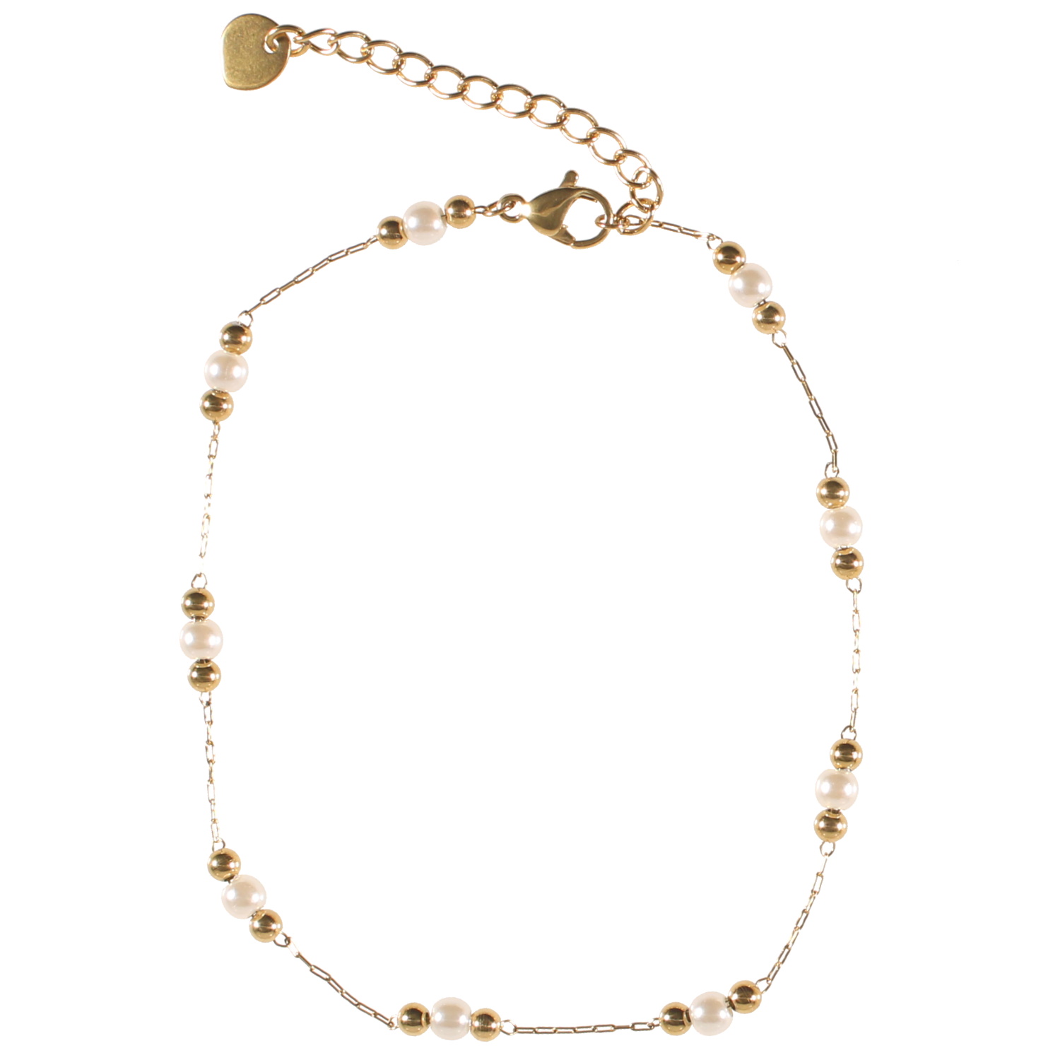 Bracelet chaîne de cheville composé d'une chaîne avec boules en acier doré et de perles d'imitation nacre.