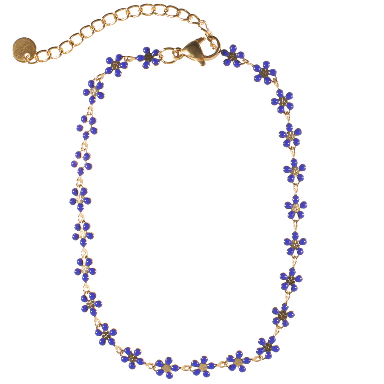 Bracelet chaîne de cheville composé d'une chaîne en acier doré et de fleurs pavées d'émail de couleur bleu.