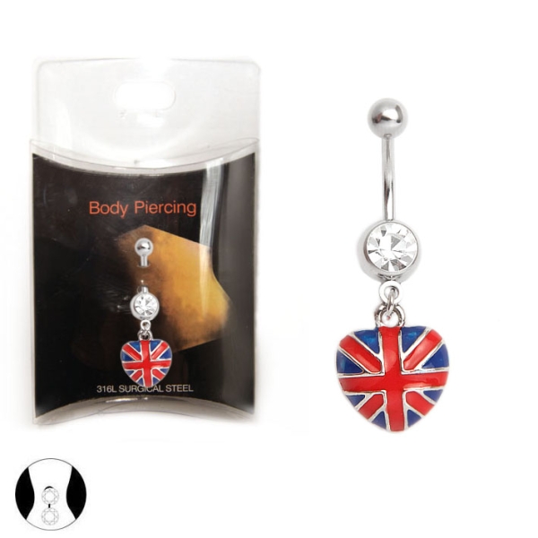 Piercing en acier chirurgical 316L et cristal.<br/>Coeur, drapeau anglais. Anglais Angleterre Coeur Drapeau  Adulte Amour Femme Géographie Indémodable