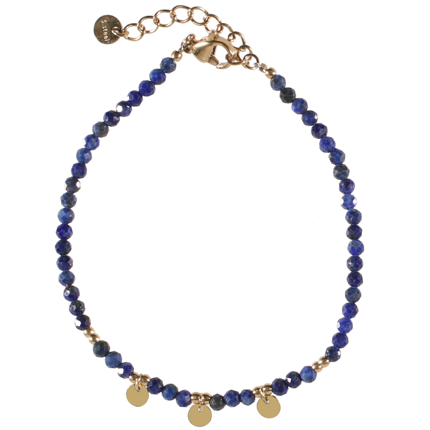 Bracelet composé de perles en véritable pierre de Lapis Lazuli et trois pampilles rondes en acier doré.