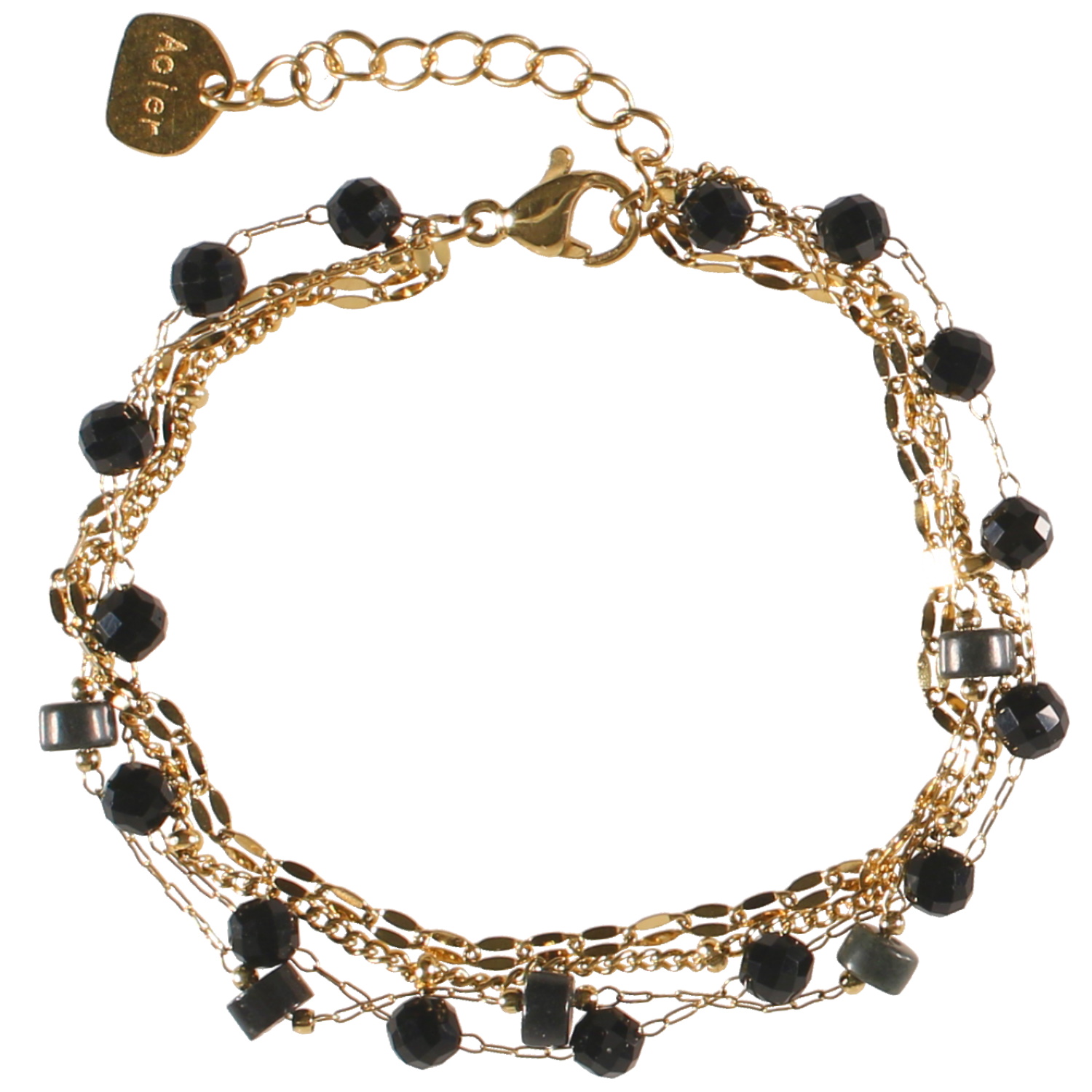 Bracelet quatre rangs composé de deux chaînes en acier doré, une chaîne en acier doré avec perles en onyx de couleur noire, ainsi qu'une chaîne en acier doré avec perles cylindriques en onyx de couleur noire.