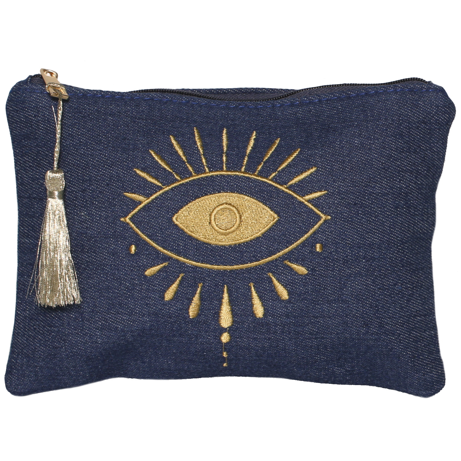 Sac pochette en coton denim avec un œil de Turquie brodé en fil doré et un pompon.