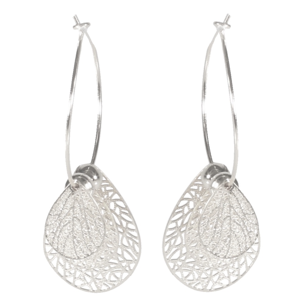 Boucles d'oreilles créoles pendantes feuilles en métal argenté.