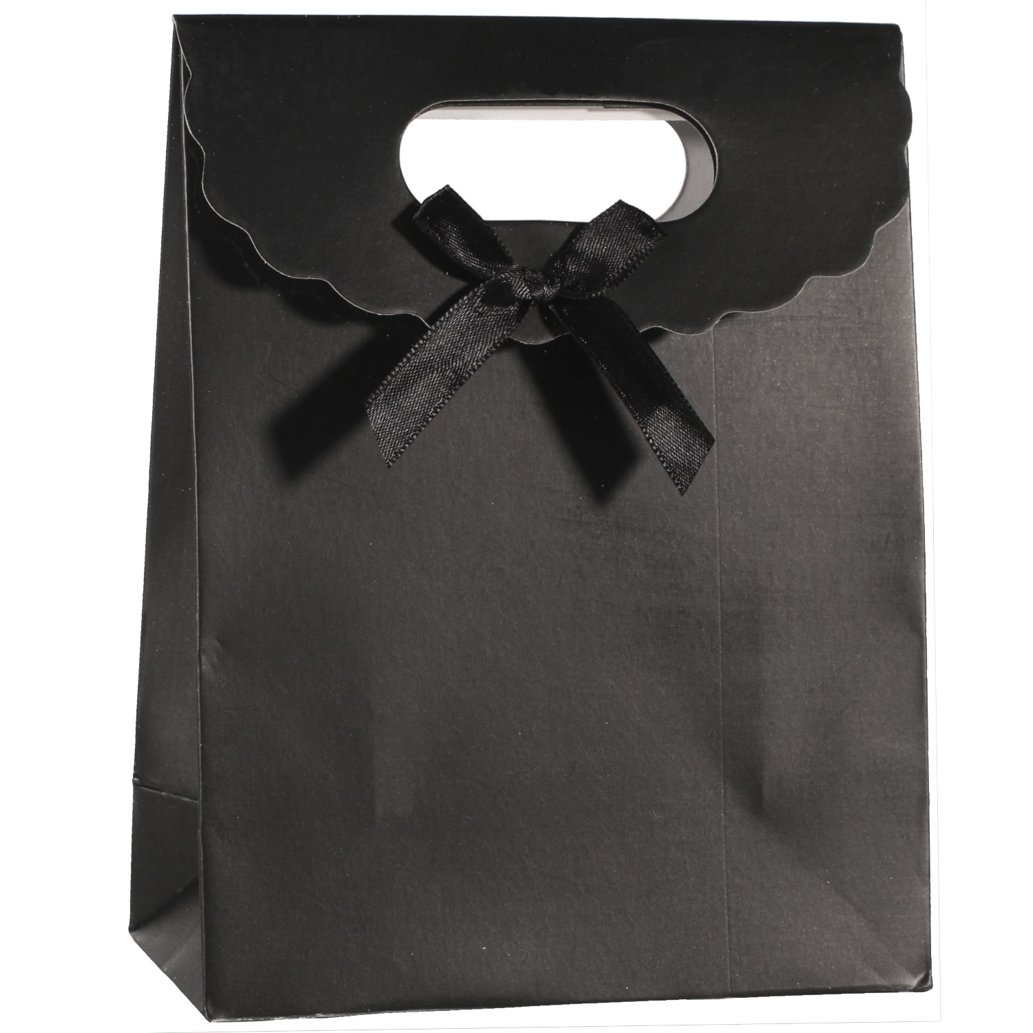 Pochette cadeau en papier cartonné et nœud papillon en textile.