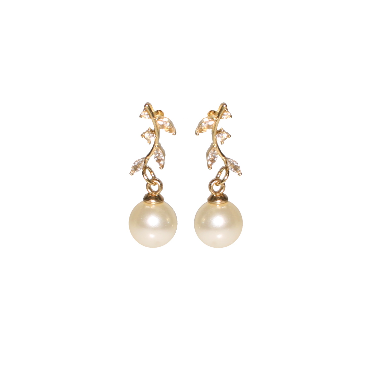 Boucles d'oreilles pendantes en forme de branche de laurier en acier doré serties de strass avec une perle d'imitation. Laurier Pendantes Perle Strass  Adolescent Adulte Femme Fille Indémodable Nature
