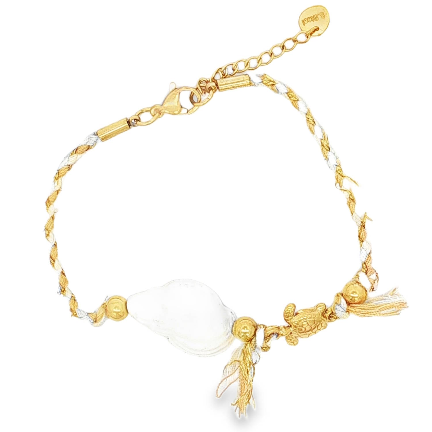Ce bracelet est orné d'un coquillage imposant de couleur blanche, qui sert de pièce maîtresse et d'une petite tortue de mer finement ciselée en acier doré, symbole de sagesse et de longévité.