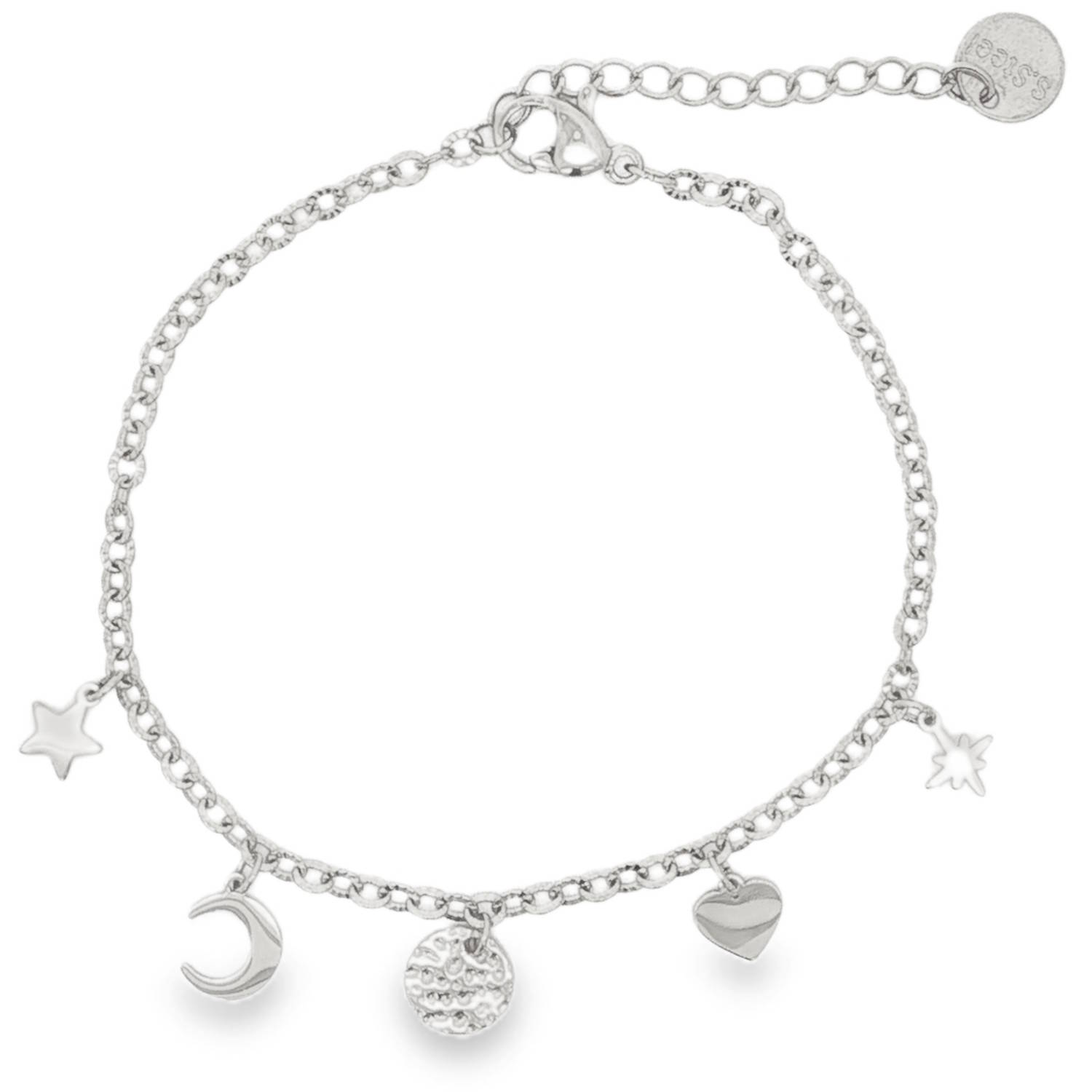 Description Ce charmant bracelet en acier argenté apporte une touche d'éclat à votre collection de bijoux. Sa délicate chaîne dorée est agrémentée de breloques fantaisistes, créant un look à la fois tendance et raffiné. Parfait pour ajouter une note ludique à votre style quotidien. Fermoir mousqueton avec 3 cm de rallonge. Longueur 16+3 cm [Guide des tailles] Largeur 10 mm Matière(s) Acier . L'acier utilisé dans la bijouterie existe sous plusieurs qualités. Nous utilisons principalement la qualité 316L, qualité qui est utilisée en chirurgie. Cet acier est donc inoxydable et reste très résistant. Fermoir Mousqueton Couleur(s) dominante(s) Argenté Public Adolescent , Adulte . Genre Femme , Fille . Saison Indémodable . Thème(s) Amour , Nature . Cliquez sur une matière, un thème, une couleur ou une collection pour voir tous les articles associés.