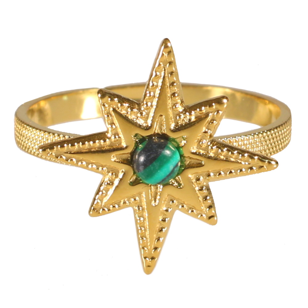 Description Bague avec une étoile en acier 316L doré surmontée d'une pierre de couleur verte de forme ronde. Taille ajustable. Largeur 16 mm Matière(s) Acier , Rocaille . L'acier utilisé dans la bijouterie existe sous plusieurs qualités. Nous utilisons principalement la qualité 316L, qualité qui est utilisée en chirurgie. Cet acier est donc inoxydable et reste très résistant. Fermoir Aucun Couleur(s) dominante(s) Doré , Vert Public Adolescent , Adulte . Genre Femme , Fille . Saison Indémodable . Thème(s) Nature . Cliquez sur une matière, un thème, une couleur ou une collection pour voir tous les articles associés.